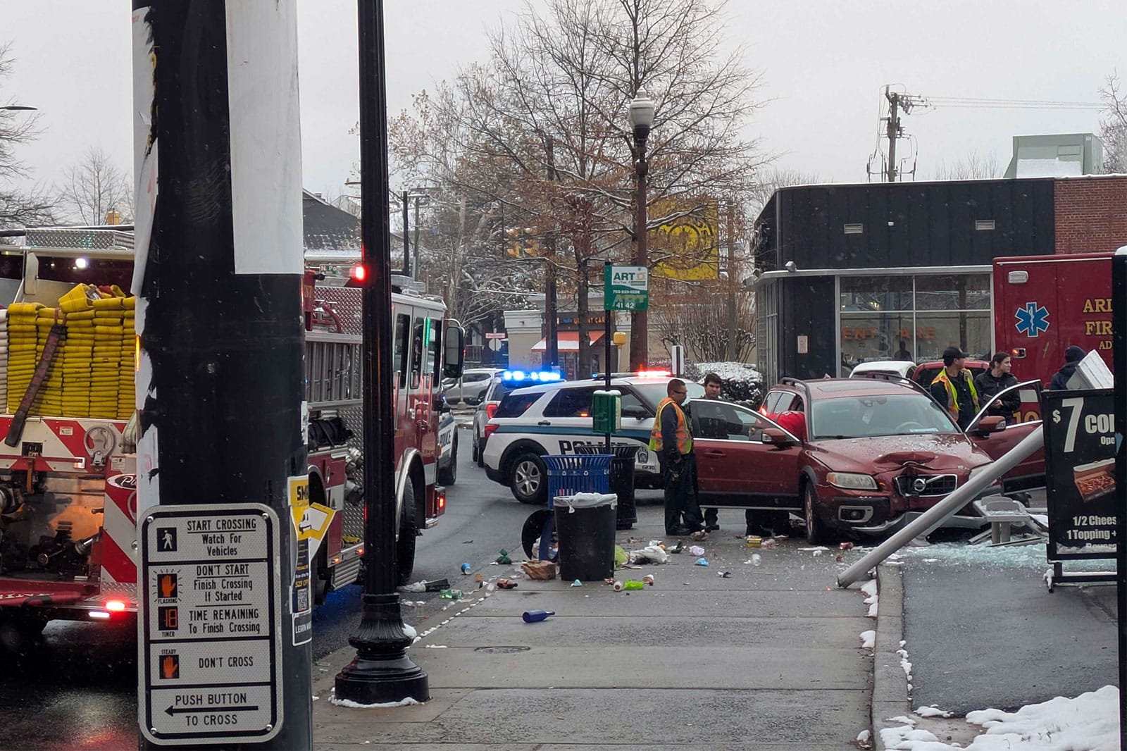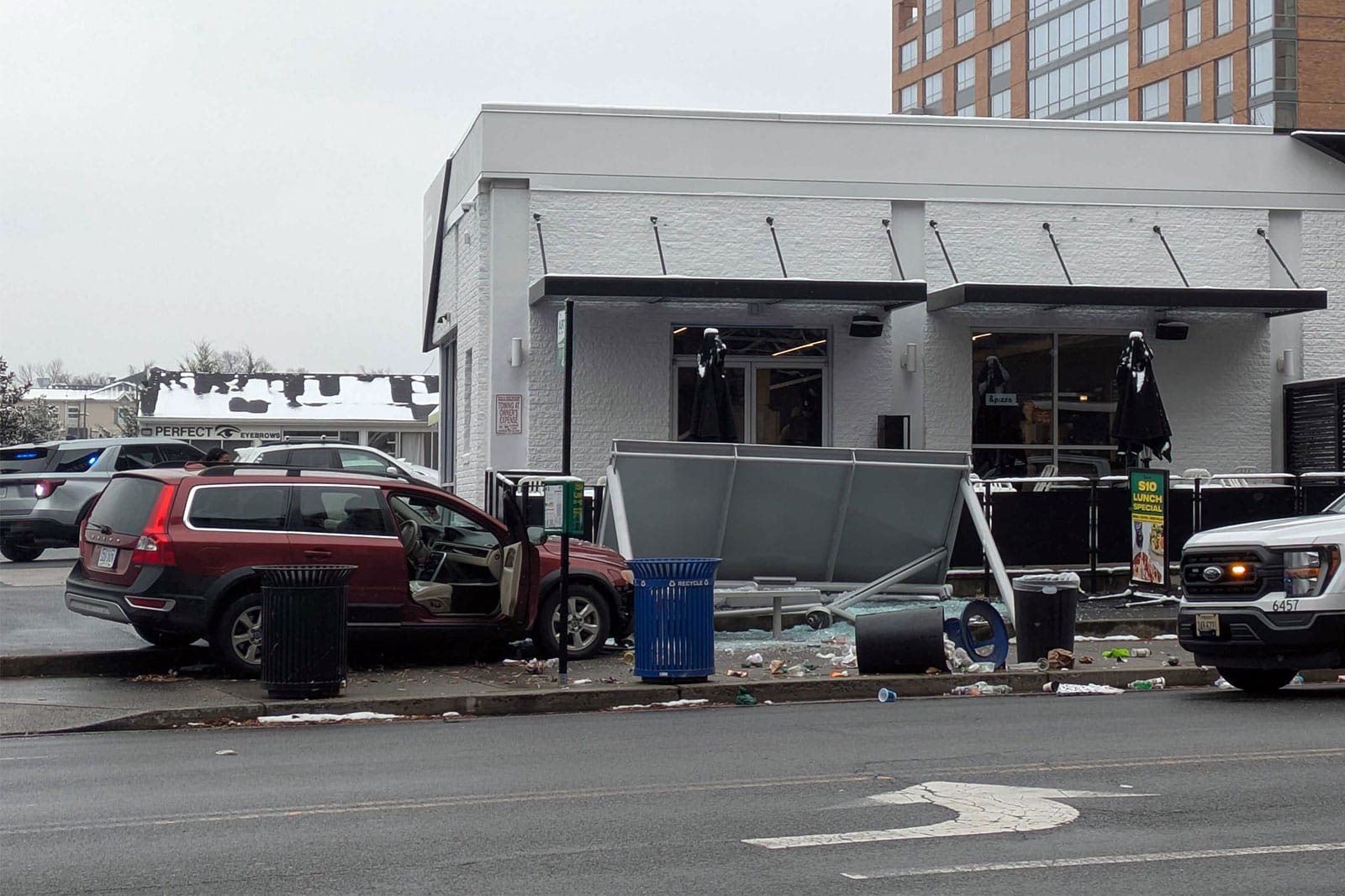 Initial reports suggest that the driver might have been suffering a medical emergency when she or he drove a Volvo station wagon into a pair of roadside waste receptacles and a glass-and-metal shelter that was instantly reduced to shards.