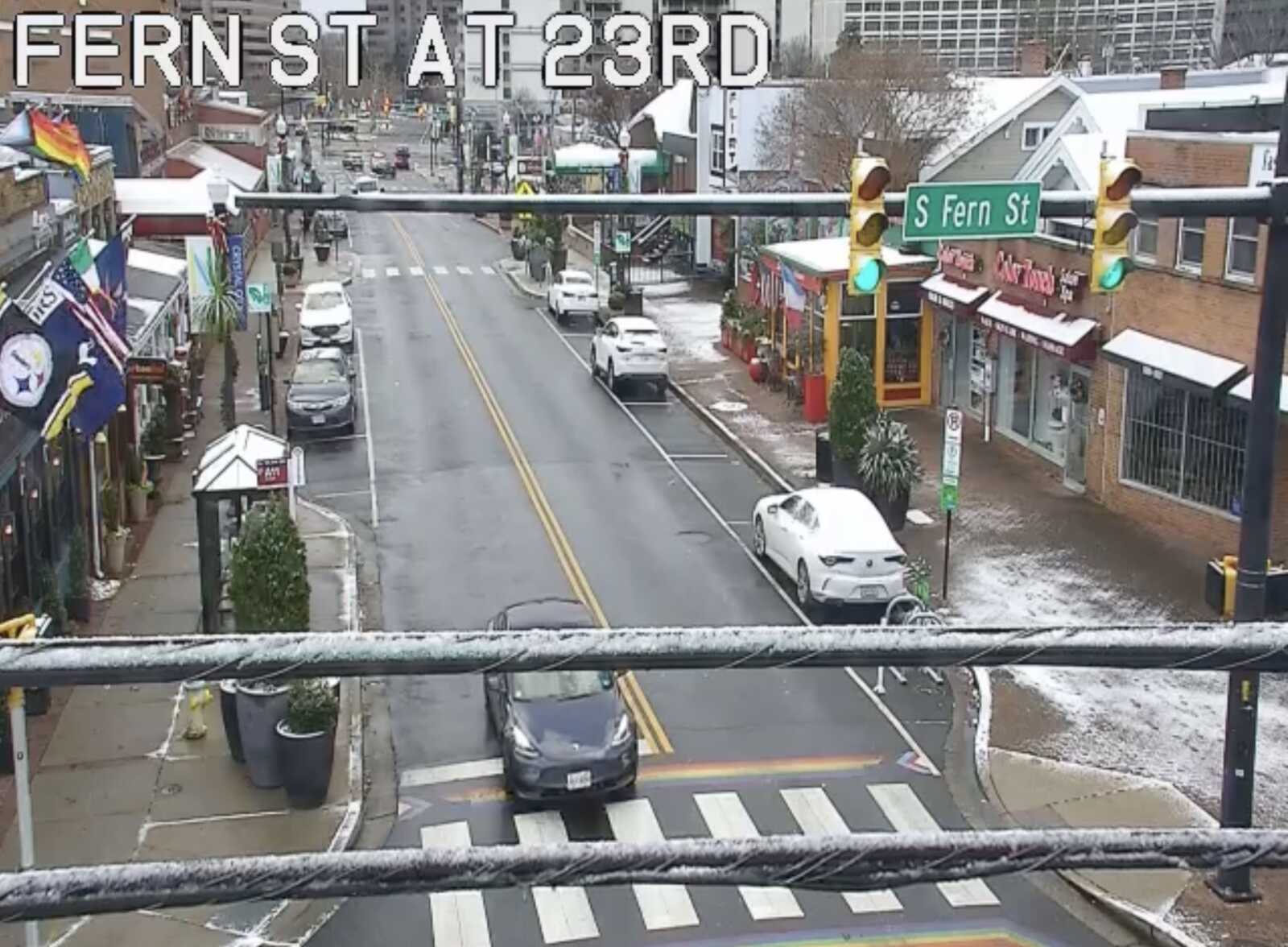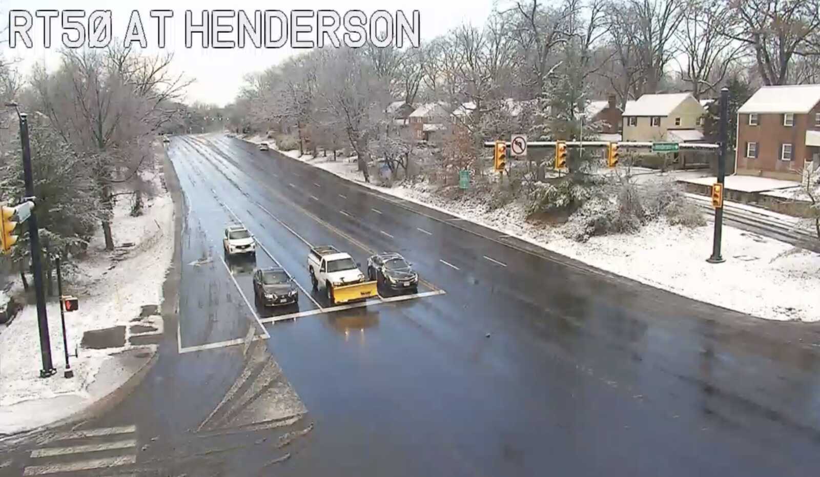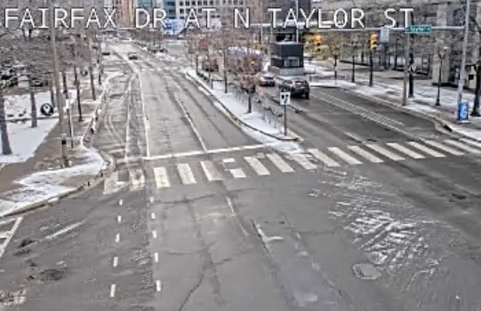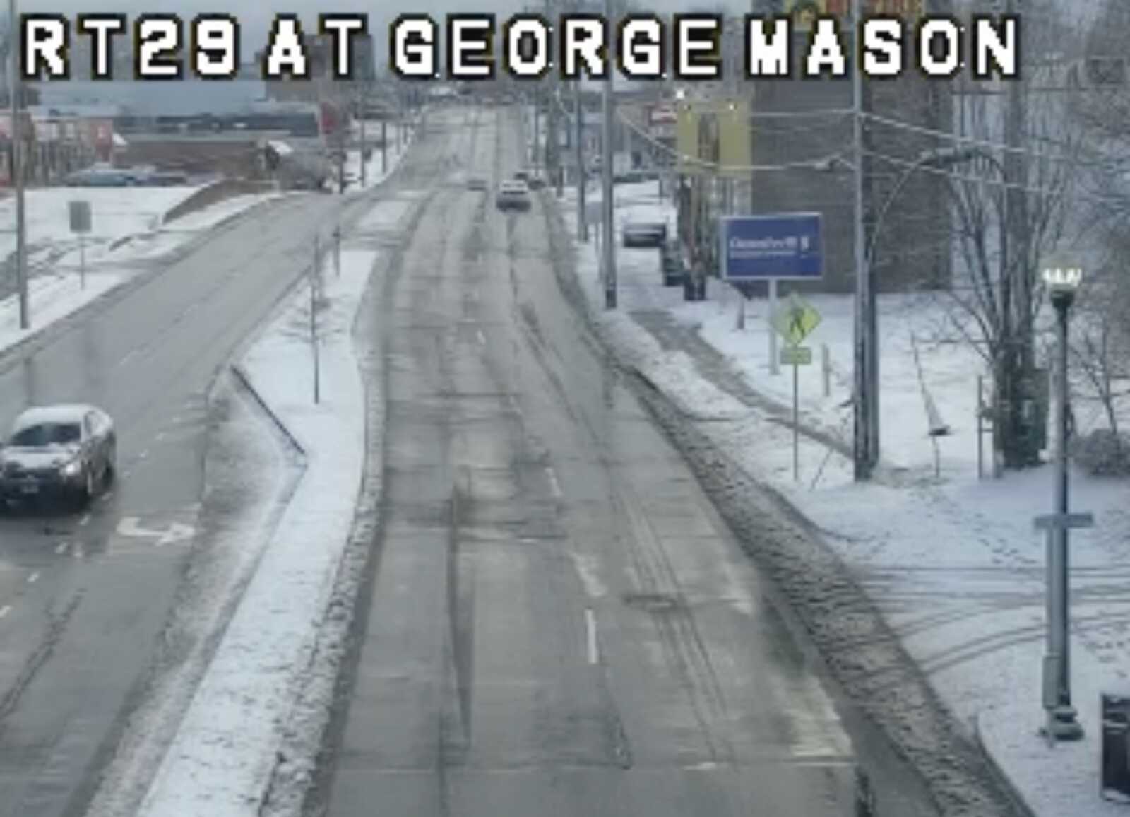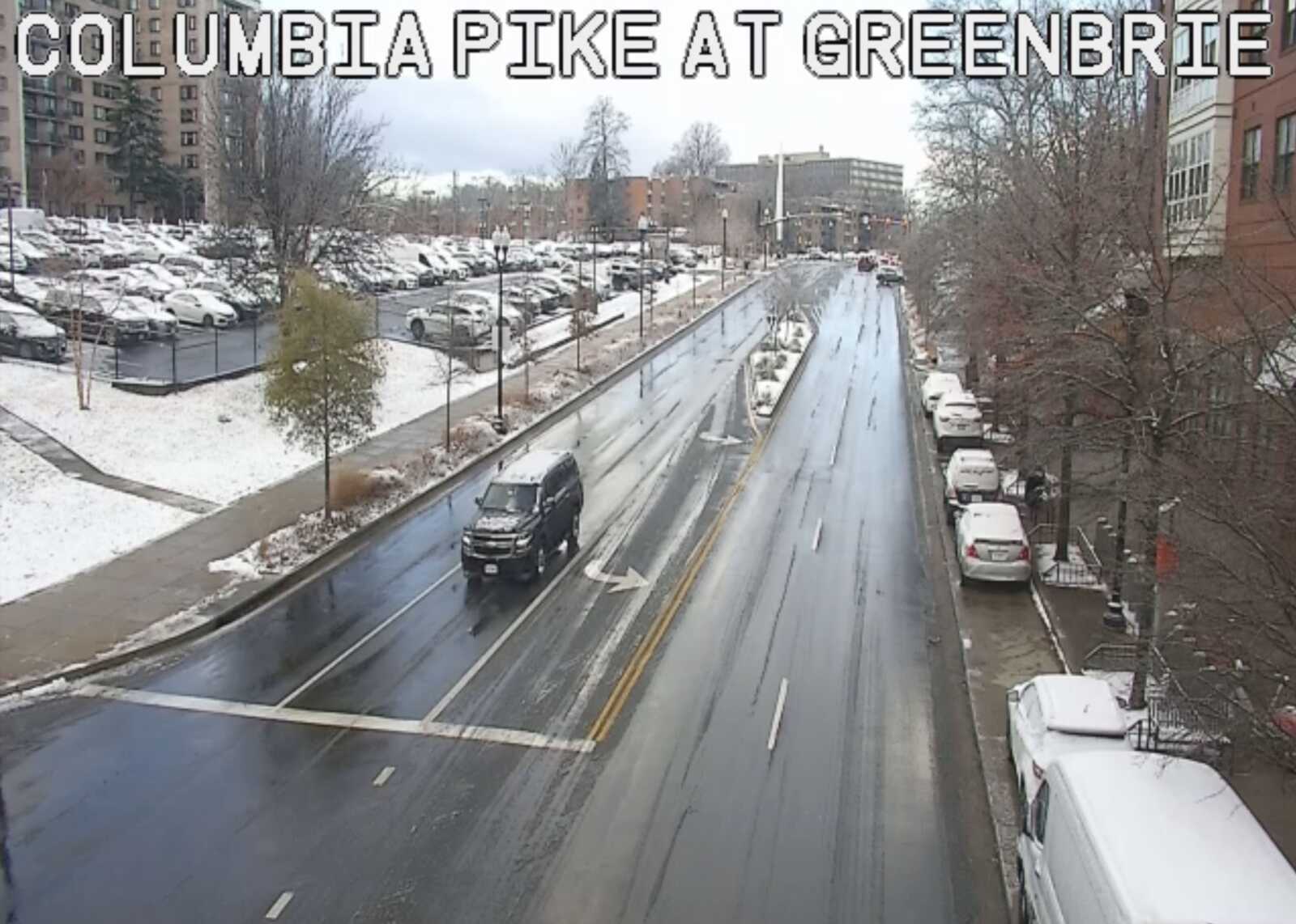 Traffic cameras show mostly wet roads, though many neighborhood streets remain snow-covered after the overnight snowfall. The last of the flakes stopped falling in Arlington around 8 a.m.