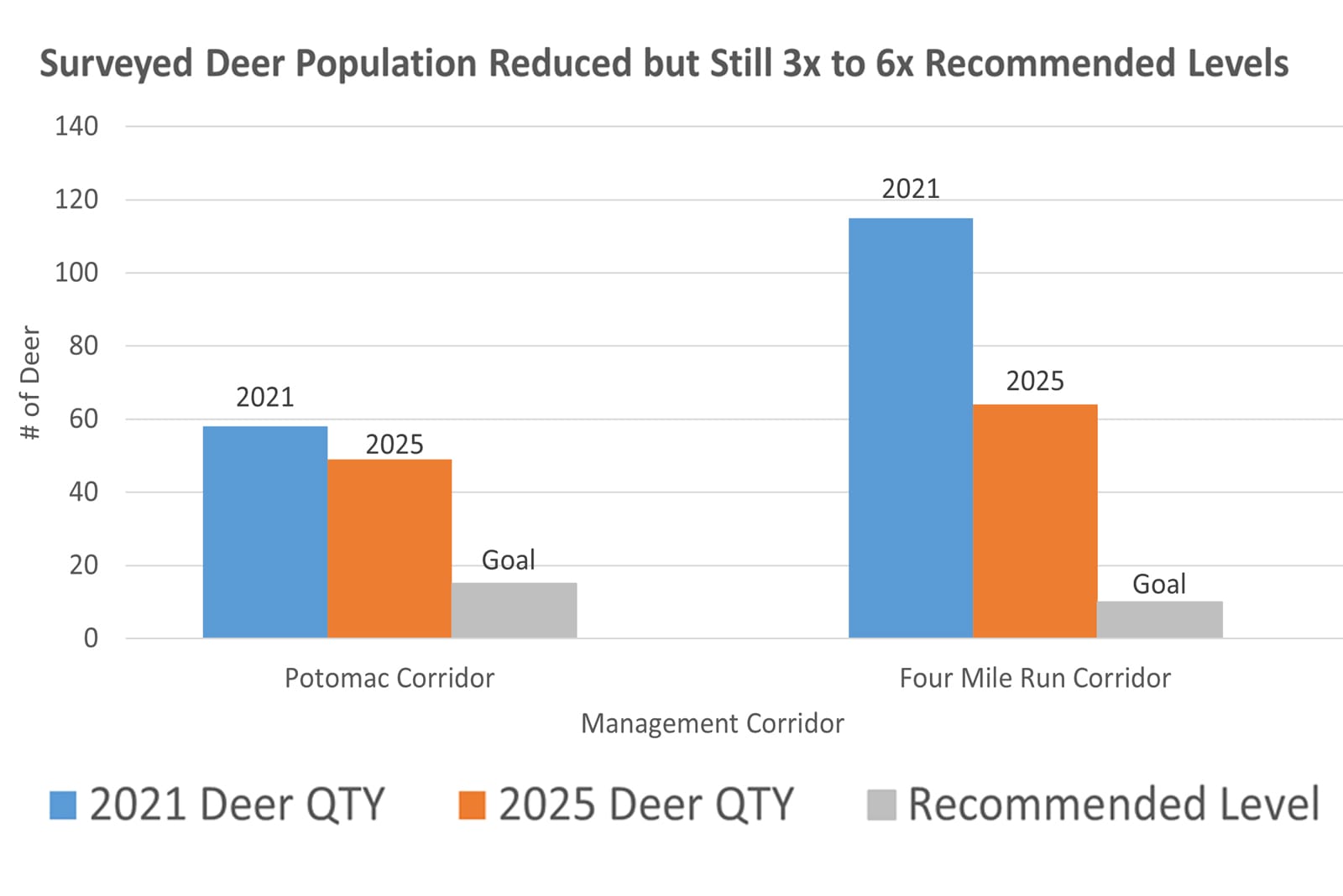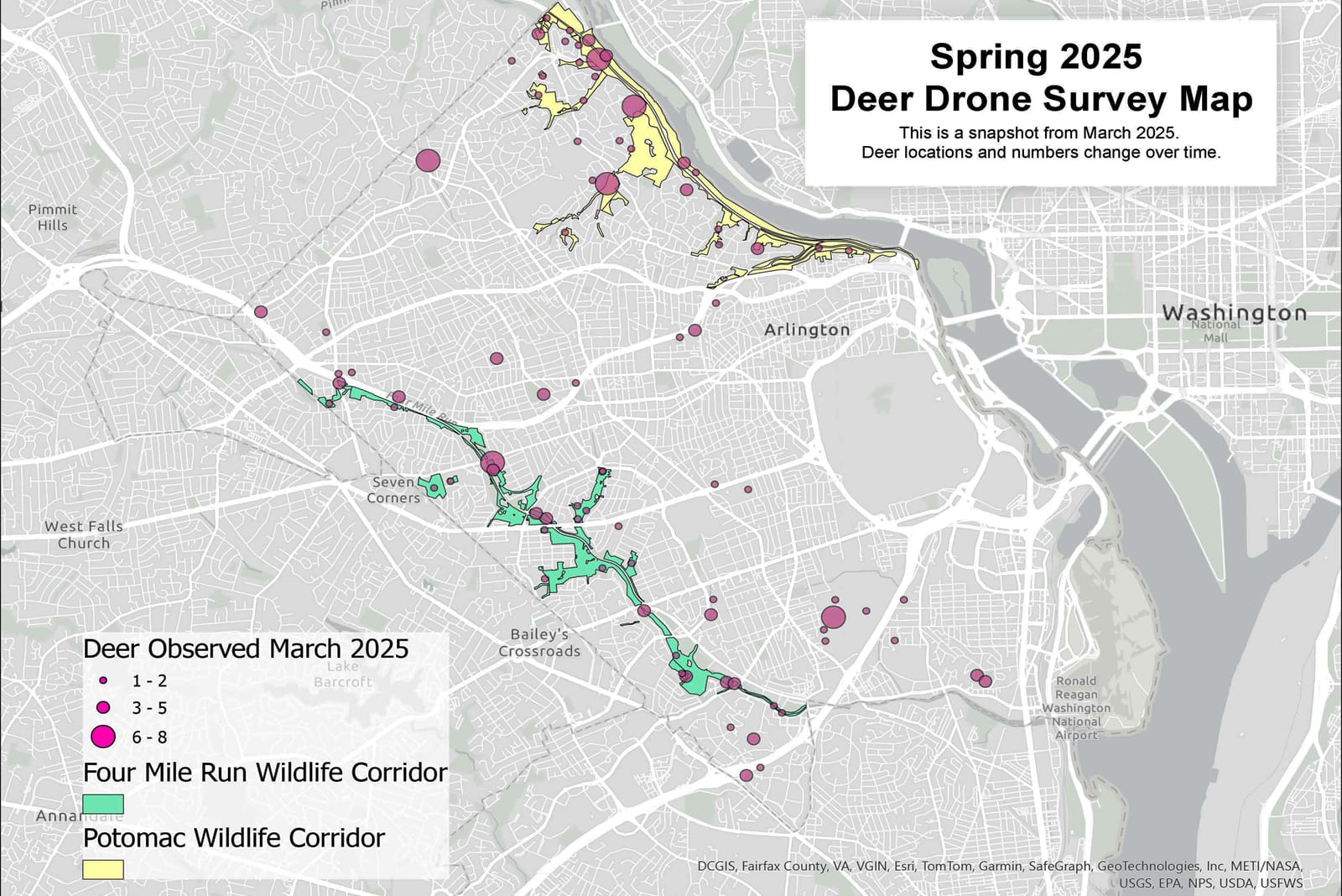 Operations will take place in forested, natural land parks within two established wildlife corridors along the Potomac River and Four Mile Run. These corridors were prioritized because they have documented deer overpopulation and contain the County’s most ecologically significant natural lands.