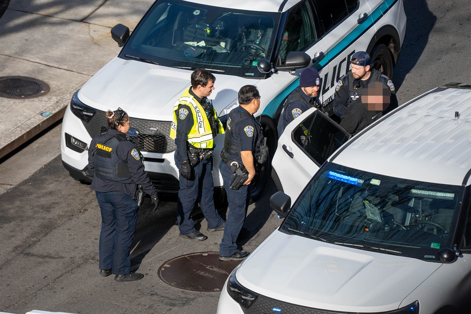 Upon safely reaching the ground, the man was loaded into the back of a police SUV.