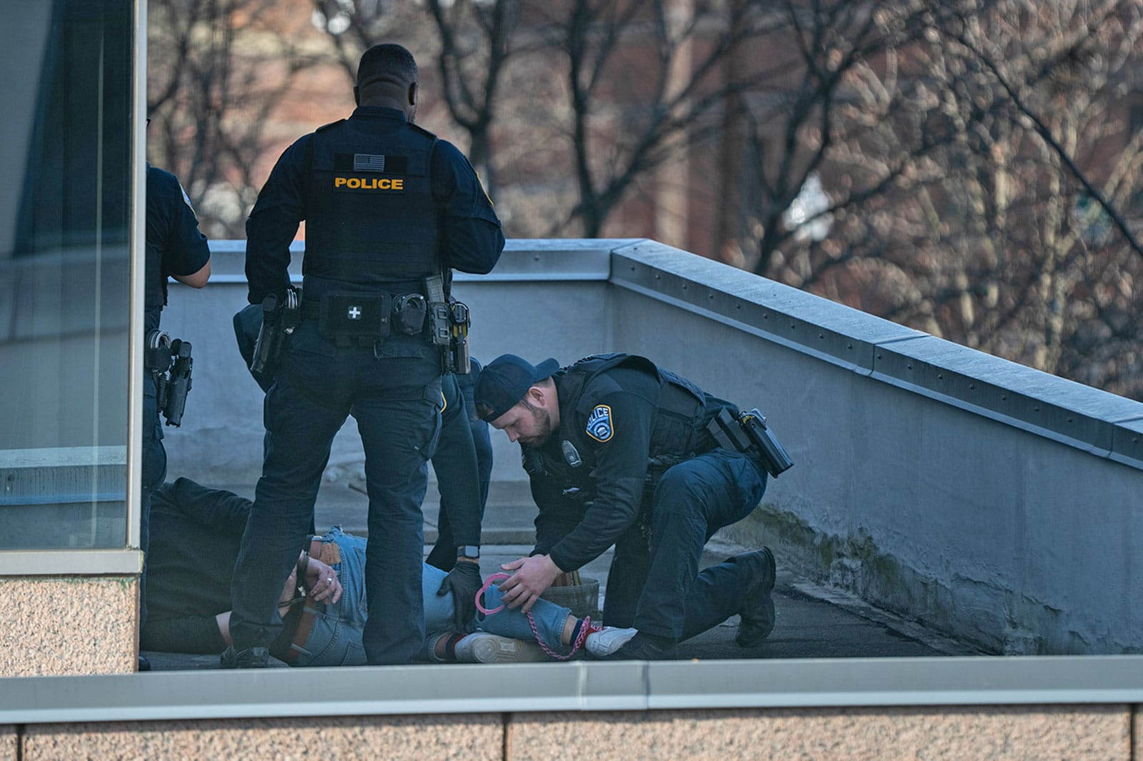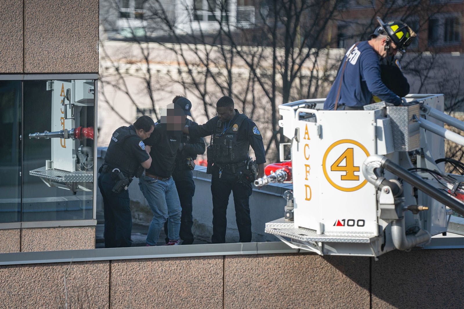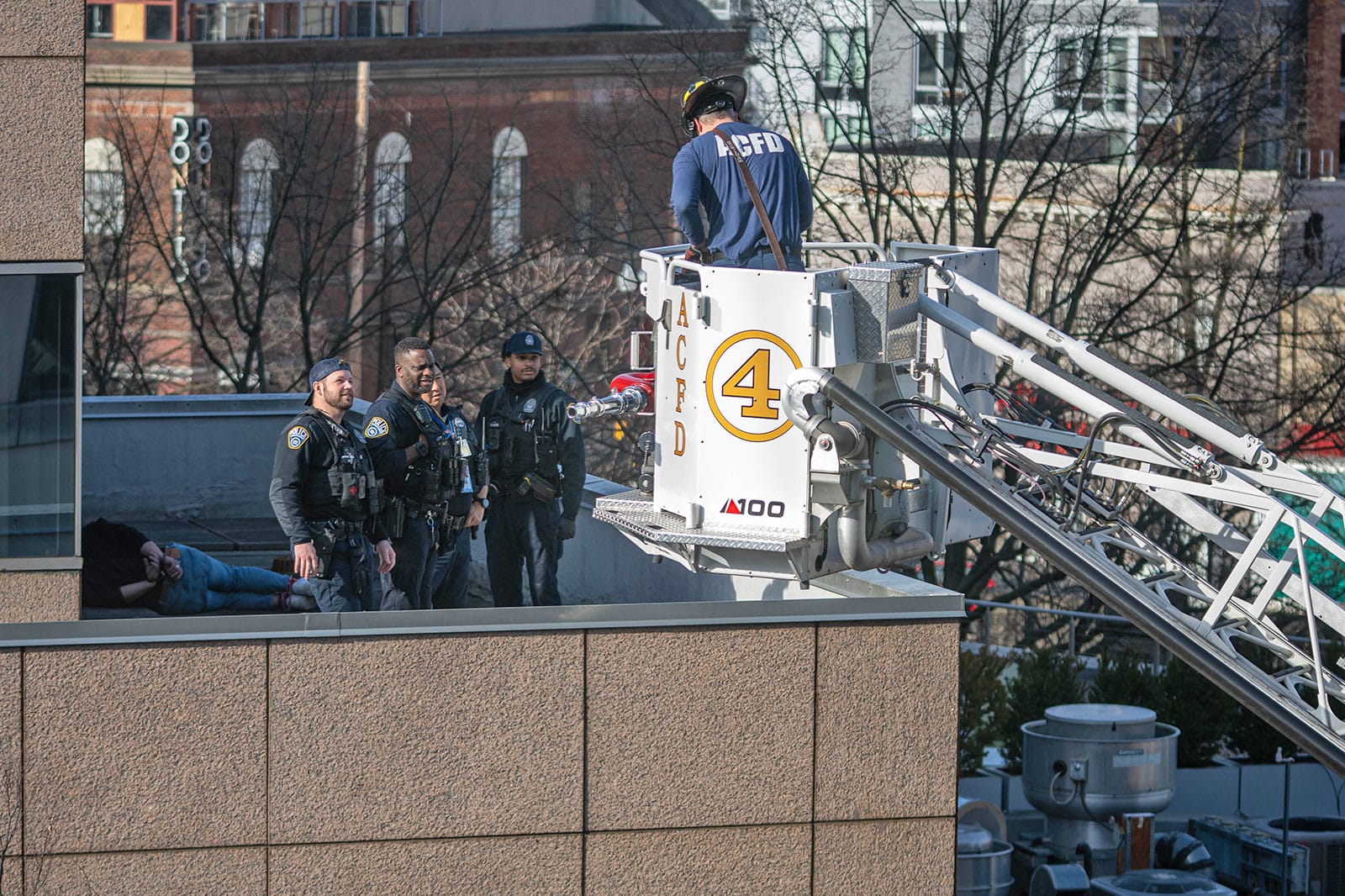 Police officers quickly reached the man, who had apparently climbed a ladder from a lower rooftop to reach his perch. They shackled him then helped him onto the bucket of an Arlington County Fire Department ladder truck.