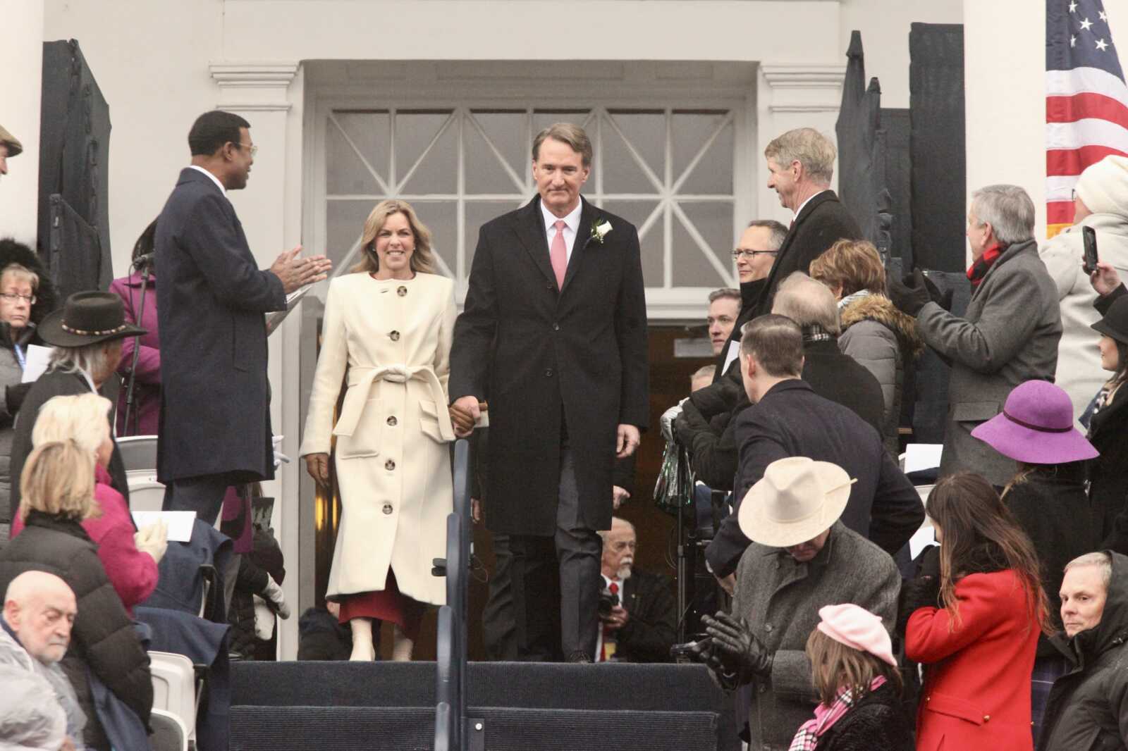 Gov. Glenn Youngkin and his wife, Suzanne, arrive at the inauguration of his successor, Gov. Abigail Spanberger, at the Virginia State Capitol in Richmond, Jan. 17, 2026 (staff photo by James Cullum)