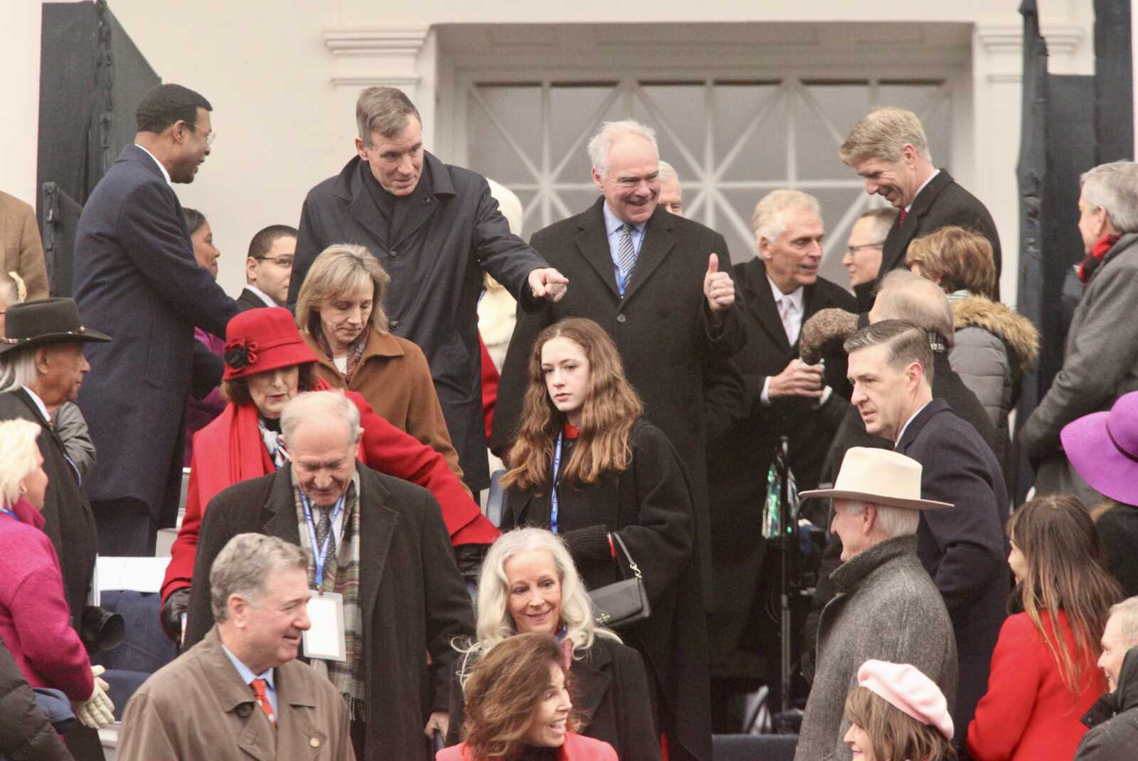 Former Virginia Governors and U.S. Senators Mark Warner (top left) and Tim Kaine at the inauguration of Gov. Abigail Spanberger at the Virginia State Capitol in Richmond, Jan. 17, 2026 (staff photo by James Cullum)