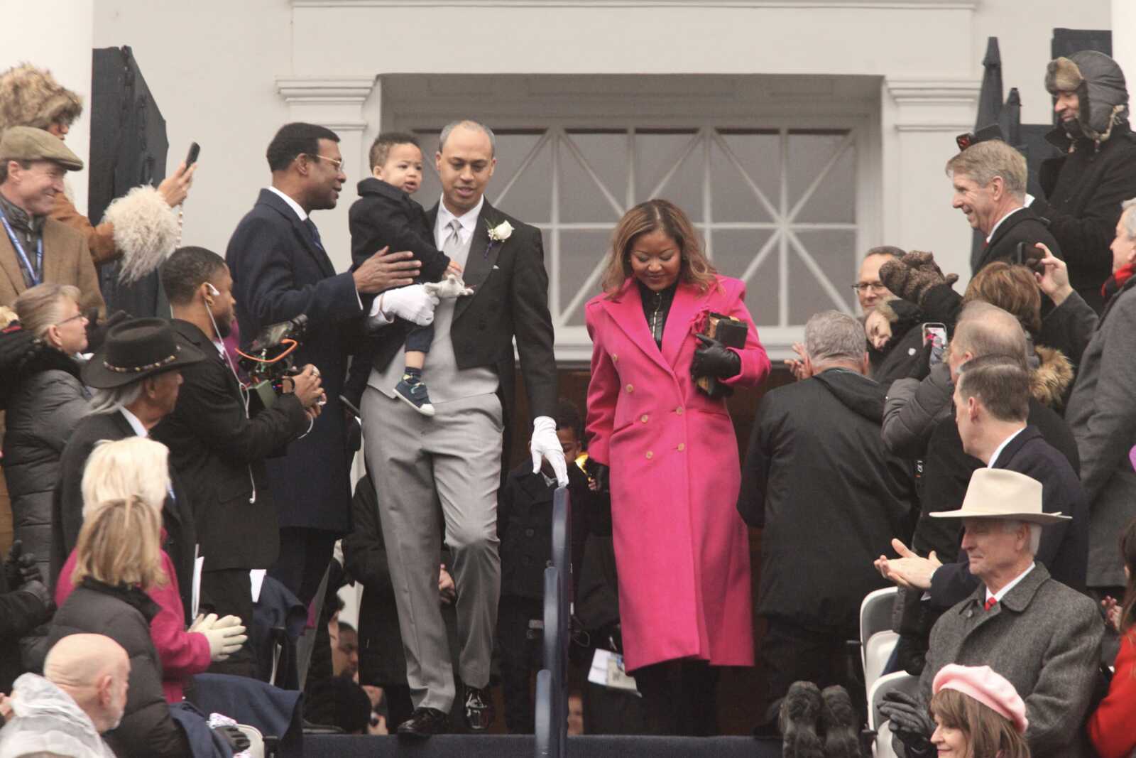 Virginia Attorney Gen.-elect Jay Jones arrives for his inauguration at the Virginia State Capitol, with his children and wife, Mavis, Jan. 17, 2026 (staff photo by James Cullum)