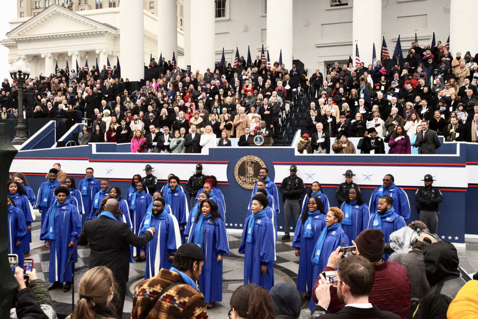 The Hampton University Concert Choir sings the National Anthem at the inauguration of Gov. Abigail Spanberger, Lt. Gov. Ghazala Hashmi and Attorney Gen. Jay Jones, at the Virginia State Capitol in Richmond, Jan. 17, 2026 (staff photo by James Cullum)