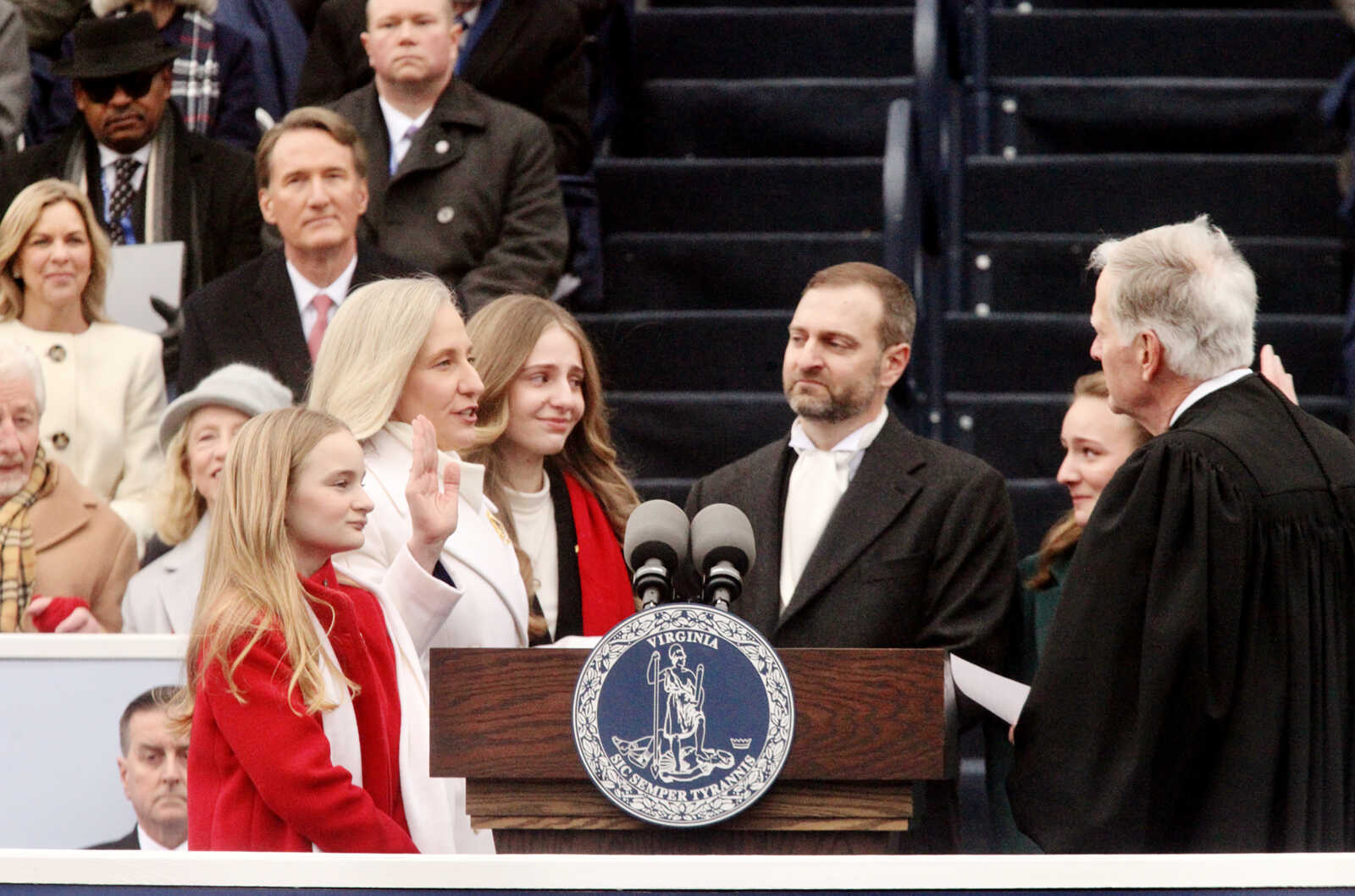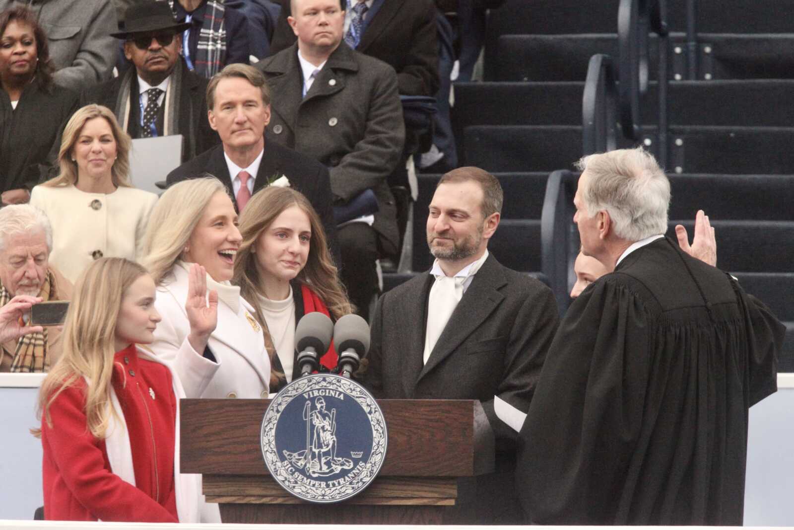 Surrounded by her family, Gov. Abigail Spanberger gets sworn into office, Jan. 17, 2026 (staff photo by James Cullum)