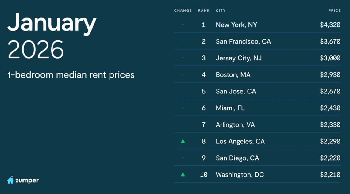 The median price of a two-bedroom apartment, $3,120, was down 0.6% month-over-month and 4.9% year-over-year in data reported Jan. 27 by Zumper. The median cost of a one-bedroom apartment, $2,330, was flat month-over-month but down 4.1% from this time last year.