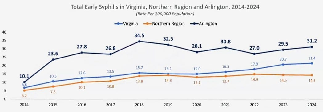 In the most recent data, from 2024, Arlington’s rate of syphilis infection — 31.2 cases per 100,000 population — was nearly 50% higher than the Virginia rate of 21.4 cases per 100,000, and was more than double that of Northern Virginia as a whole (14.3 cases per 100,000).
