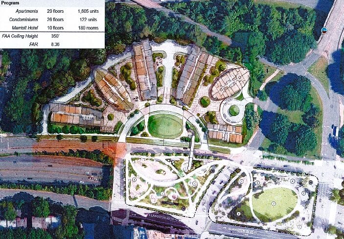 Plans for the Potomac Overlook development call for public space in about two-thirds of a vacant 5.5-acre lot at 1401 Langston Blvd — acting as “an extension” of neighboring Gateway Park, Chris Gladstone, president of D.C.-based Quadrangle Development Corporation, told ARLnow.