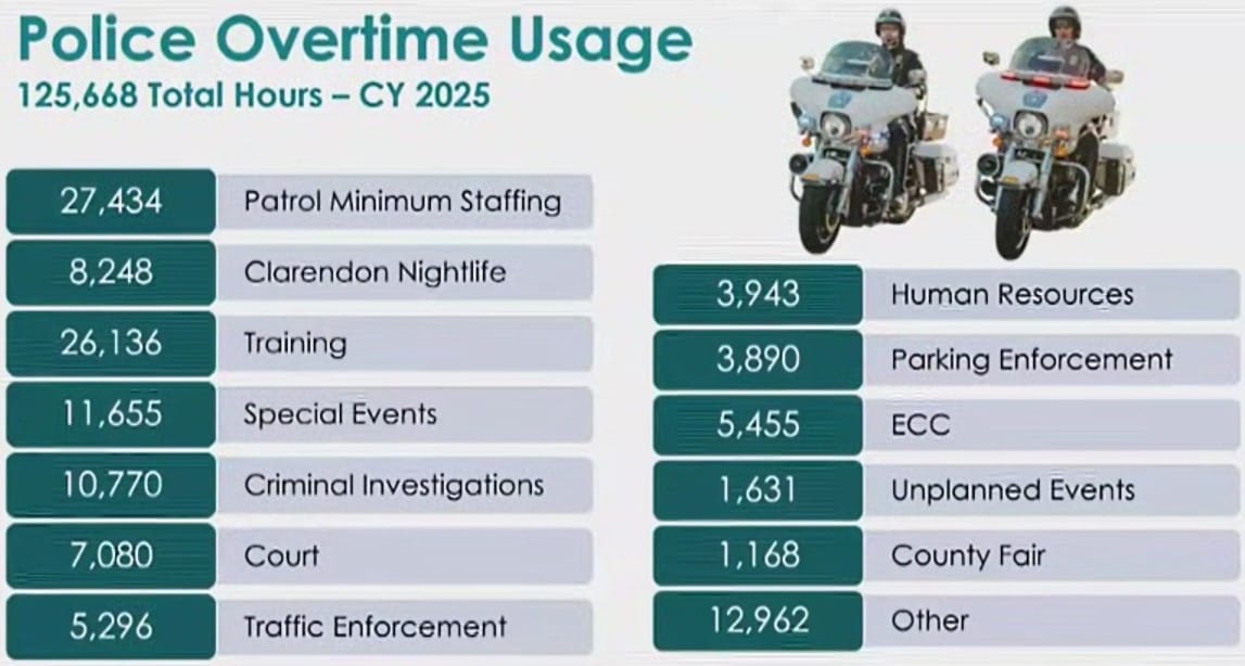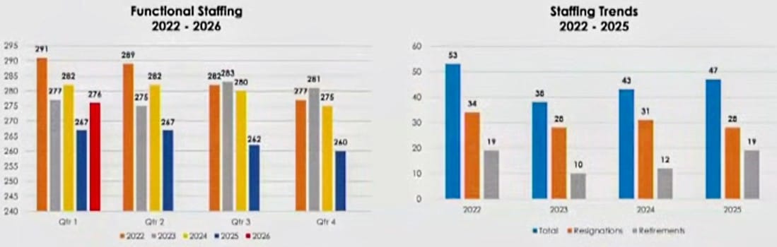 Weak staffing levels have led to increases in overtime. In calendar year 2025, the department paid out nearly 126,000 hours in overtime.