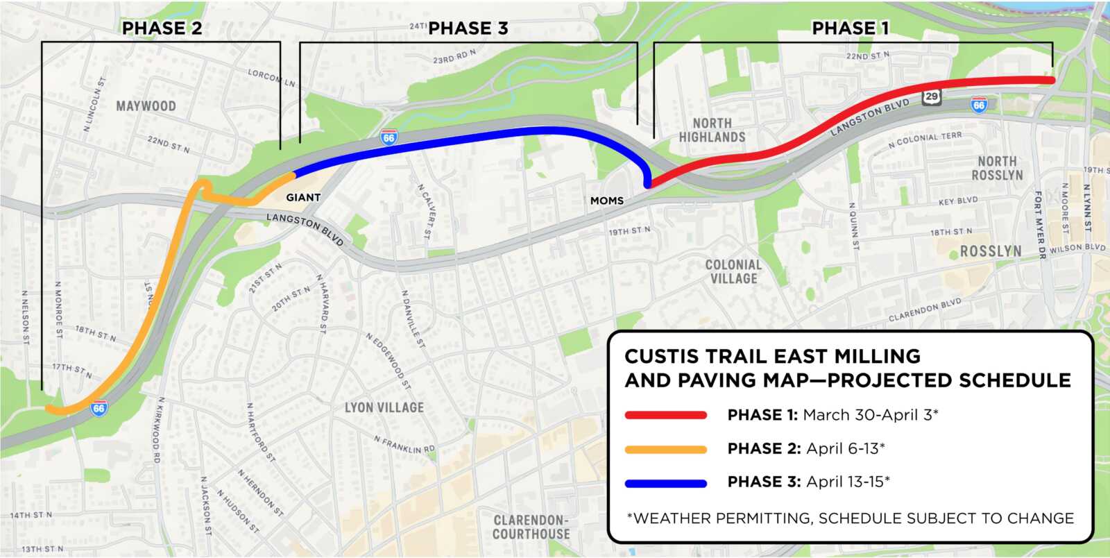 - April 13-15: Langston Blvd (Lyon Village) to 21st St N (near Mom’s Organic Market)