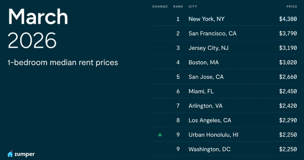 Median rents for one-bedroom units in the six most expensive localities were $4,380 in New York City; $3,790 in San Francisco; $3,190 in Jersey City; $3,020 in Boston; $2,660 in San Jose; and $2,450 in Miami.