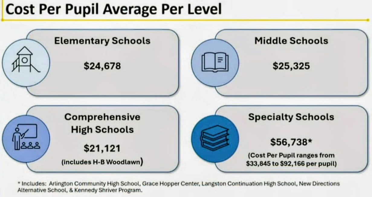 For 2025-26, Falls Church ranks behind Arlington as second most expensive at $23,988, followed by $23,835 per student in Loudoun County. Alexandria City Public Schools is spending $22,242, while per-student costs are $21,986 in Fairfax County and $20,233 in Prince William County.