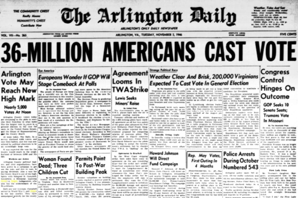 In its Nov. 6 edition, the Arlington Daily’s banner headline blared “NEW DEAL DIES, GOP HOLDS CONGRESS.” Its front page was a mix of national, state and local election results — few of them good news for Democrats, be they of the liberal or conservative wing of the party.