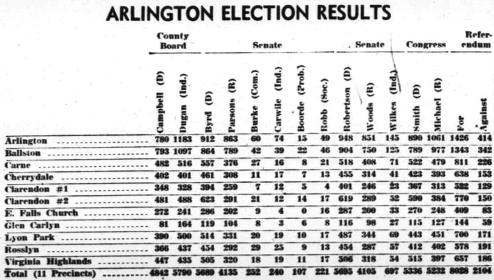 That same November 1952 election also included a referendum on incorporation as a city. The final tally: 3,450 Arlington voters in favor, 27,523 against.