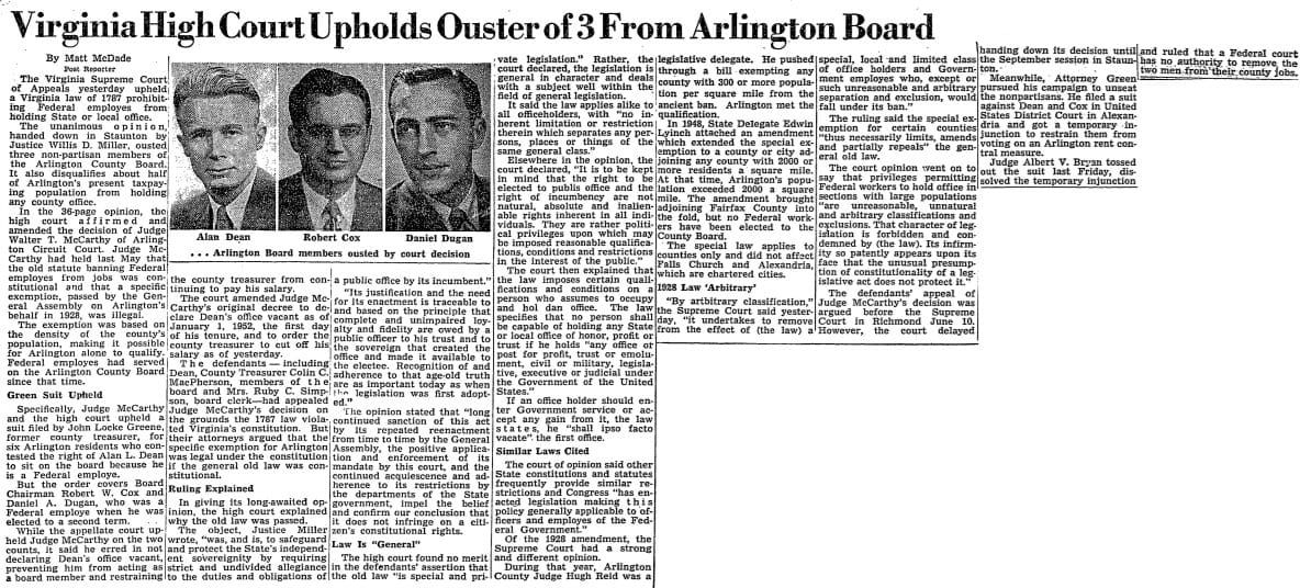 Dugan, Dean, Cox and their supporters were banking on a 1928 law, passed by the General Assembly specifically for Arlington, providing an exemption from the prohibition on federal workers in local elected office.