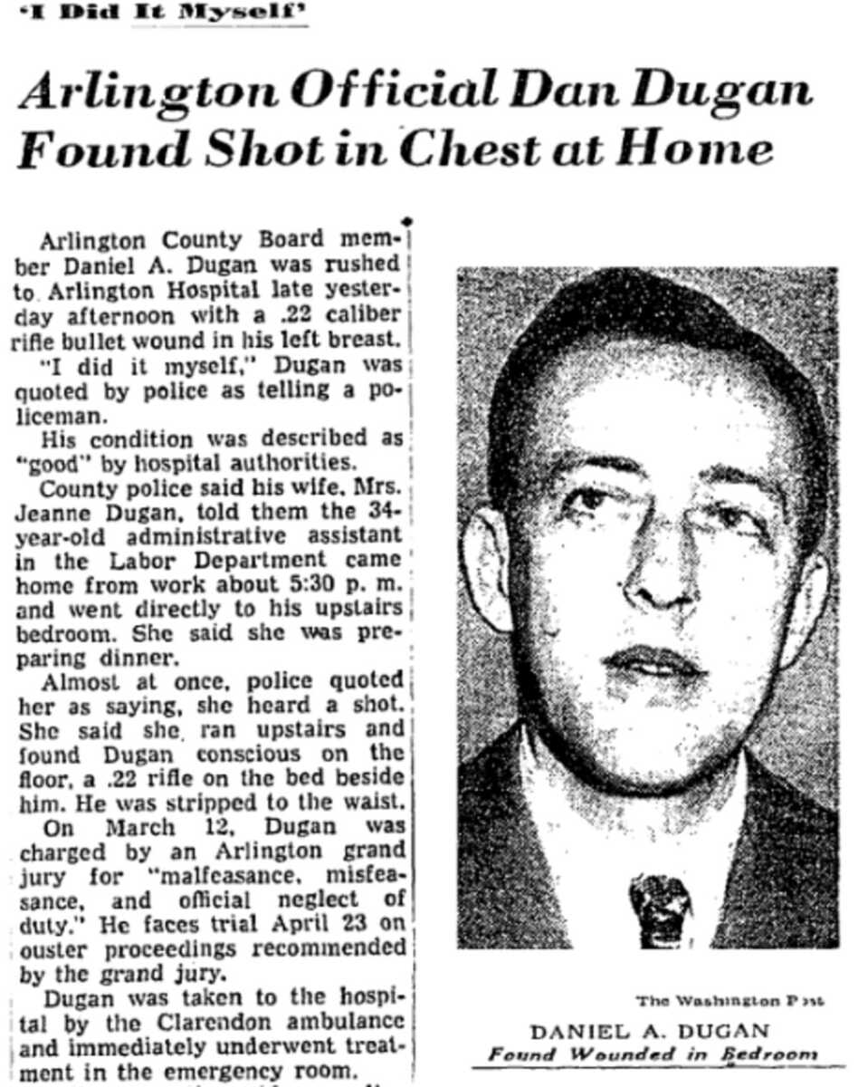 Before getting to the events of 1952 that saw the three County Board independents kicked out of office, it’s worth pausing at a somewhat bizarre occurrence the preceding year. In late March 1951, local newspapers reported that Dugan was in Arlington Hospital following a self-inflicted gunshot wound to the chest.