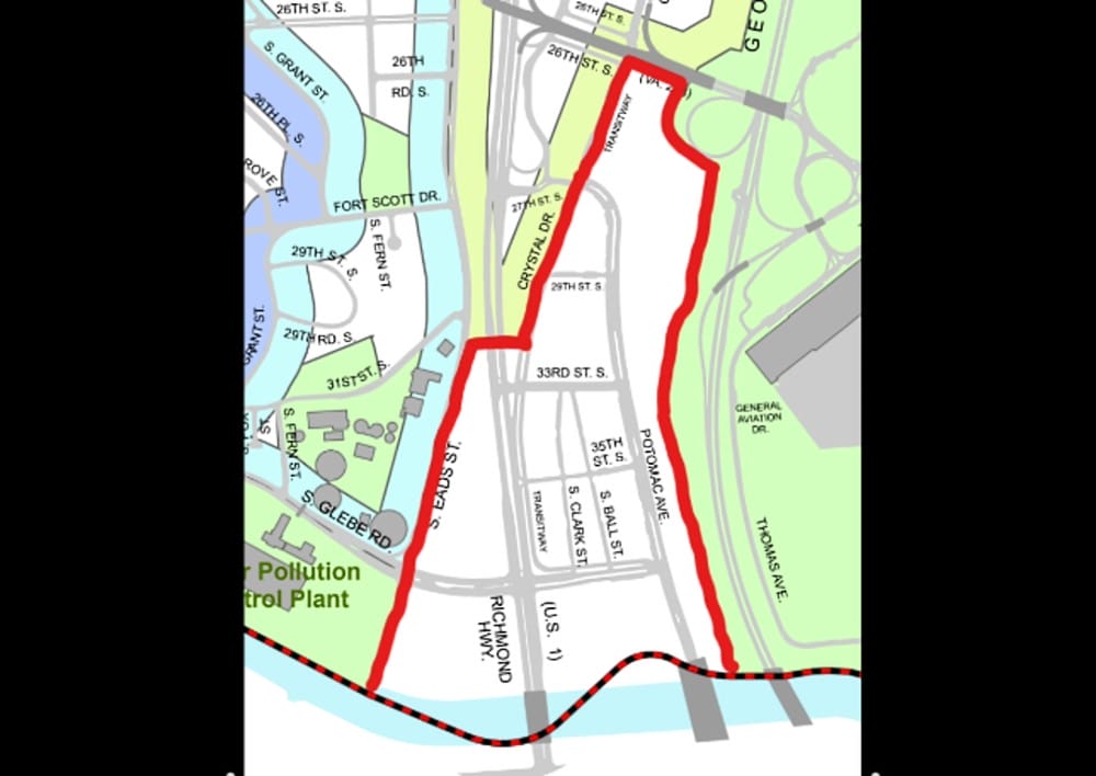 - To the west, S. Eads Street from Four Mile Run north to a point between 31st Street S and 33rd Street S., then crossing Richmond Highway (U.S. Route 1) and continuing north along Crystal Drive to 26th Street S.