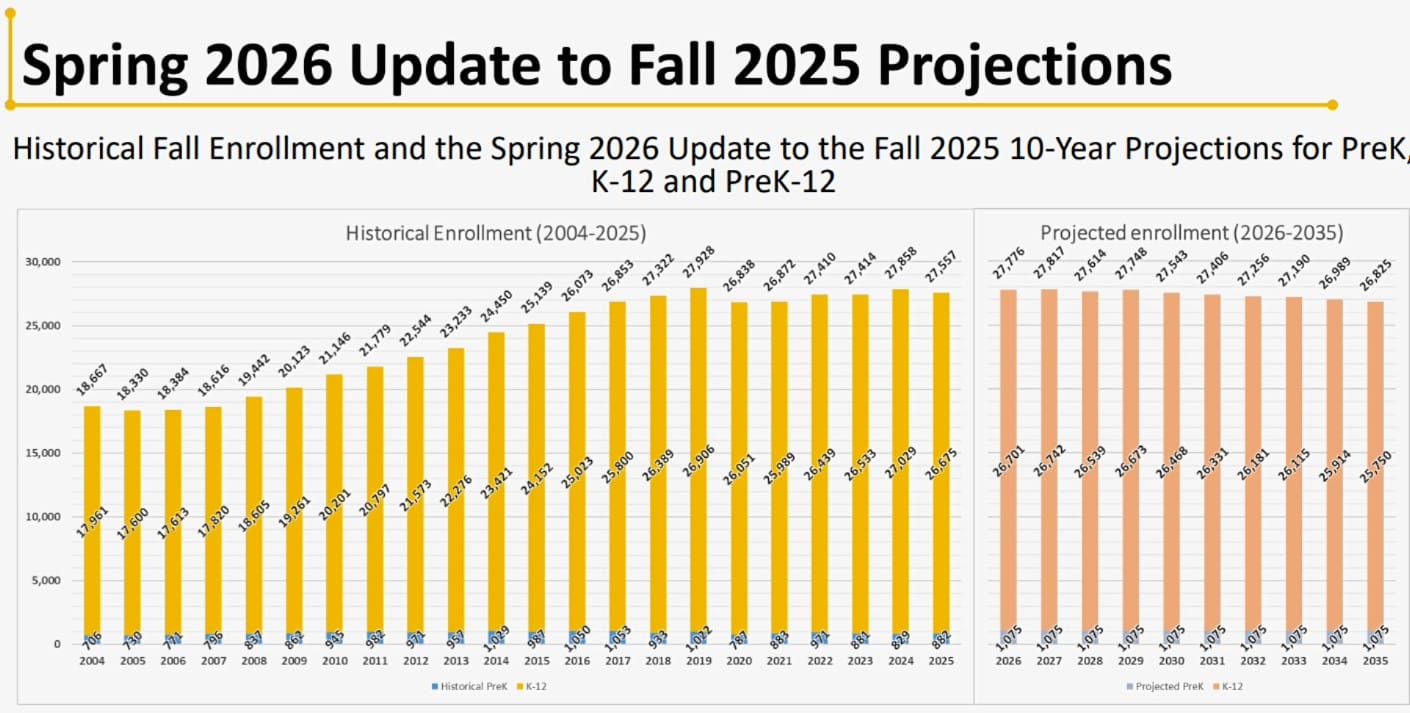 Moving into the future, new estimates anticipate 27,776 students in class at the start of the 2026-27 school year. From there, “we’re projecting pretty much a leveling off,” Lin said.