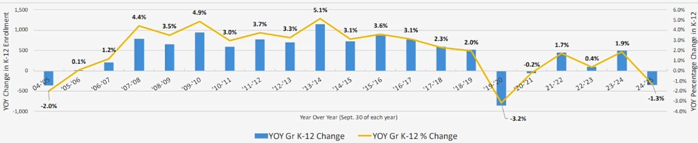 The 2025-26 enrollment total represented the first year-over-year drop for the school system in two decades, excepting the Covid years of 2020 and 2021.