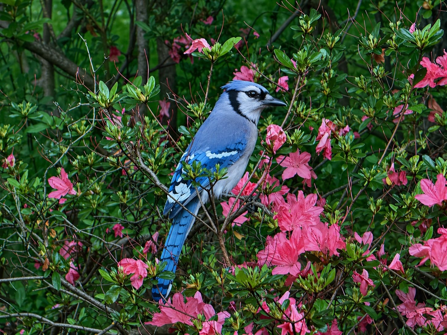 A blue jay perched in blooming azaleas, in a local backyard (staff photo)