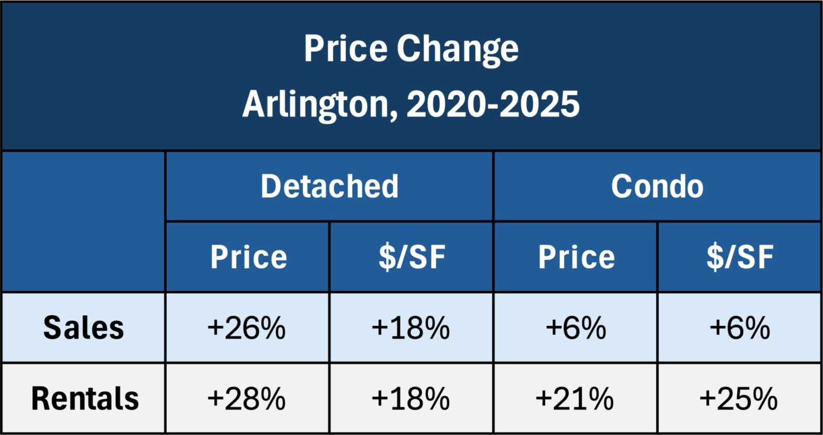 Since 2020, the cost of renting a detached home in Arlington increased at a similar rate as the cost of buying a detached home; 26% and 28%, respectively.