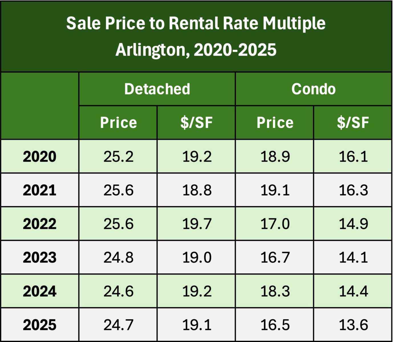 The table below shows the average price and $/SF of buying a detached home or condo relative to the average annual rent for a detached home or condo, in Arlington. Higher multiples show that buying is becoming more expensive relative to renting.