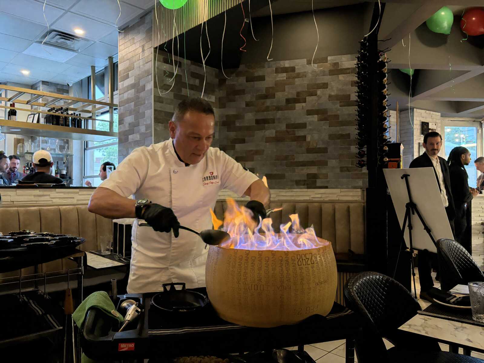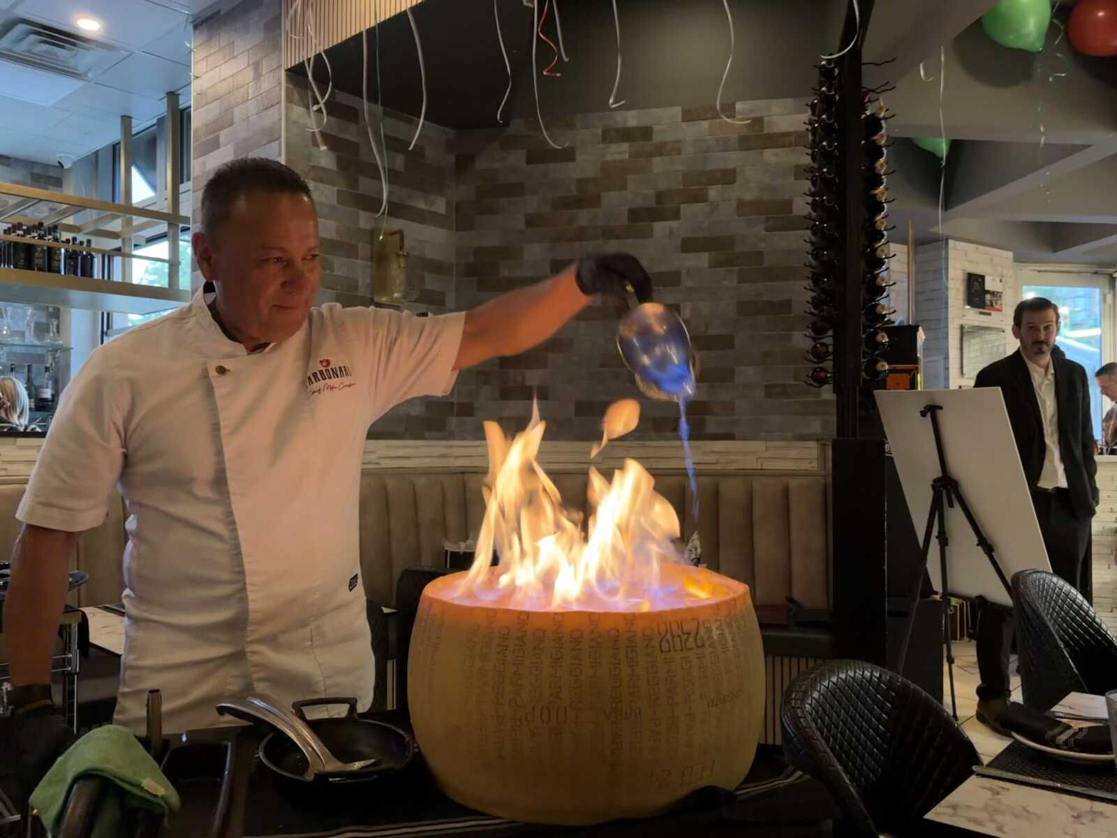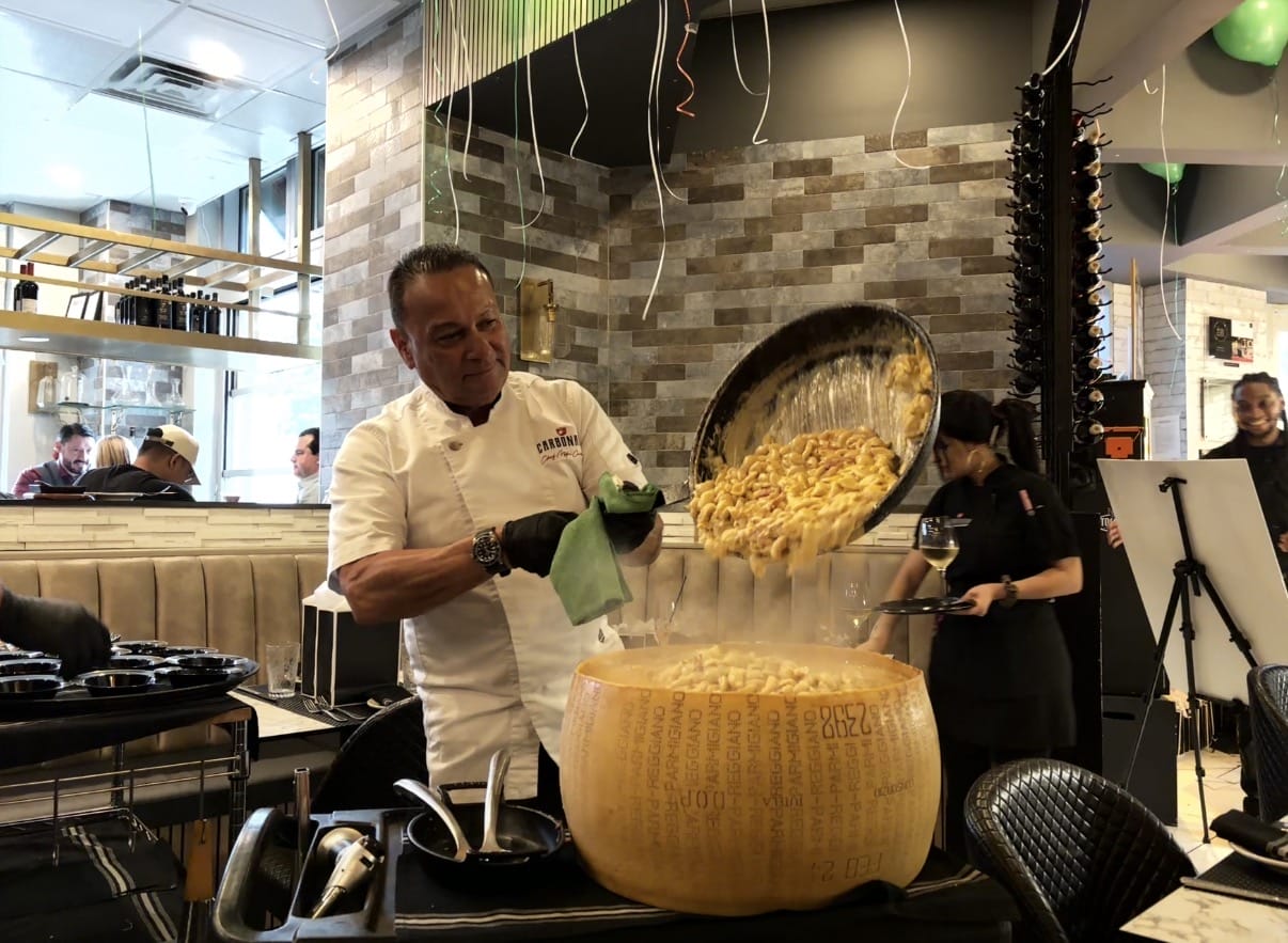 Carbonara celebrated its anniversary last night (Wednesday) with live music, Aperol spritz and plenty of hearty Italian fare to go around. With its signature carbonara bucatini prepared tableside in a fiery, 80-pound wheel of parmesan, the restaurant has been the subject of much attention since its opening in March 2024.
