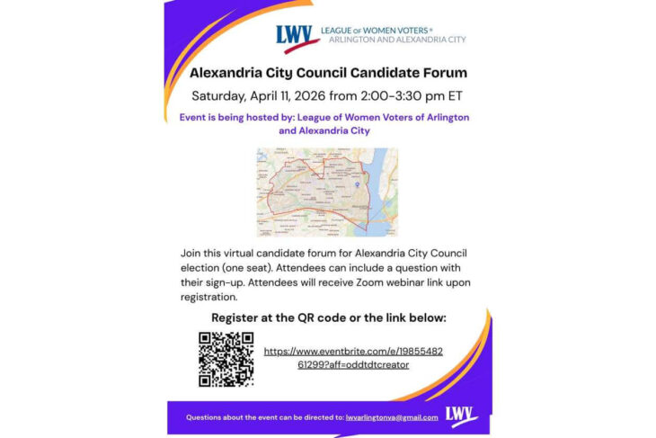 Alexandria City Council virtual Candidate Forum Saturday, 11 April 2:00pm – 3:30pm hosted by League of Women Voters of Arlington & Alexandria City.