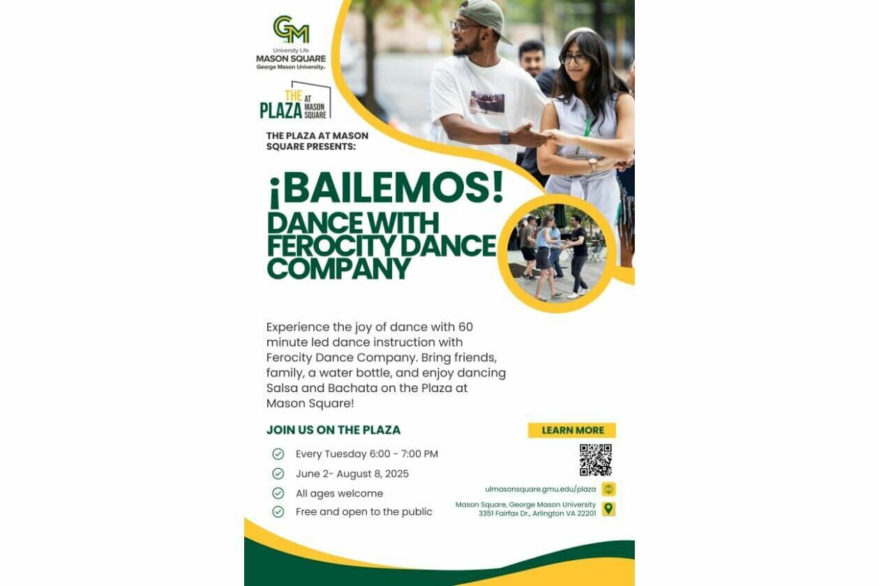 Experience the joy of dance with 60 minute led dance instruction with Ferocity Dance Company. Bring friends, family, a water bottle, and enjoy dancing Salsa and Bachata on the Plaza at Mason Square!