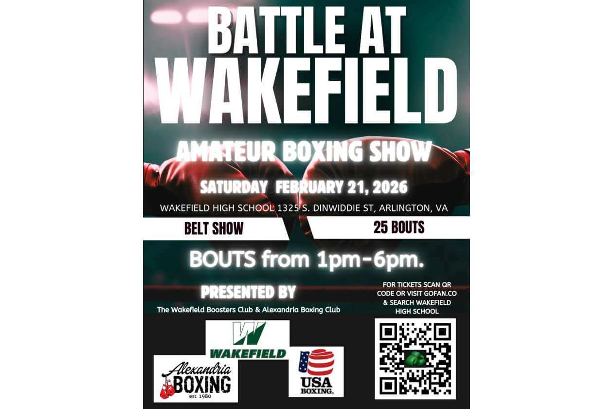 The Wakefield High School Athletic & Activities Office and the Wakefield Boosters organization are hosting Battle at Wakefield, bringing competitive boxing to Wakefield High School with a 25-bout belt show featuring talented athletes from Alexandria Boxing Club and across the region. ALL PROCEEDS benefit Wakefield High School’s Athletic and Activities Programs and the Wakefield Boosters Club.
