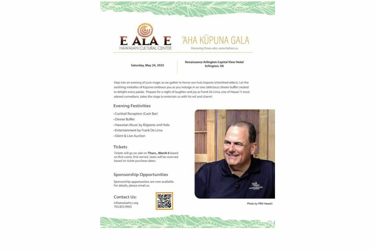 Join us for an unforgettable evening at our 2025 `Aha Kūpuna (Precious Elders) Gala on Saturday, May 24, 2025, at the Renaissance Arlington Capital View Hotel from 5:00PM – 10:00PM honoring those who came before us and embracing aloha!