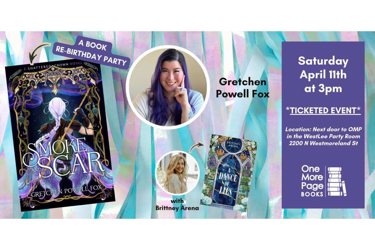 Celebrate the re-birth of SMOKE AND SCAR with its traditional publishing release and Gretchen’s ACTUAL birthday! Gretchen will be in conversation with author Brittney Arena (A DANCE OF LIES). Join us to hear their discussion of SMOKE AND SCAR, and enjoy some tasty treats before the authors sign books! This is a ticketed event, and each ticket includes a copy of SMOKE AND SCAR in either paperback or hardcover.