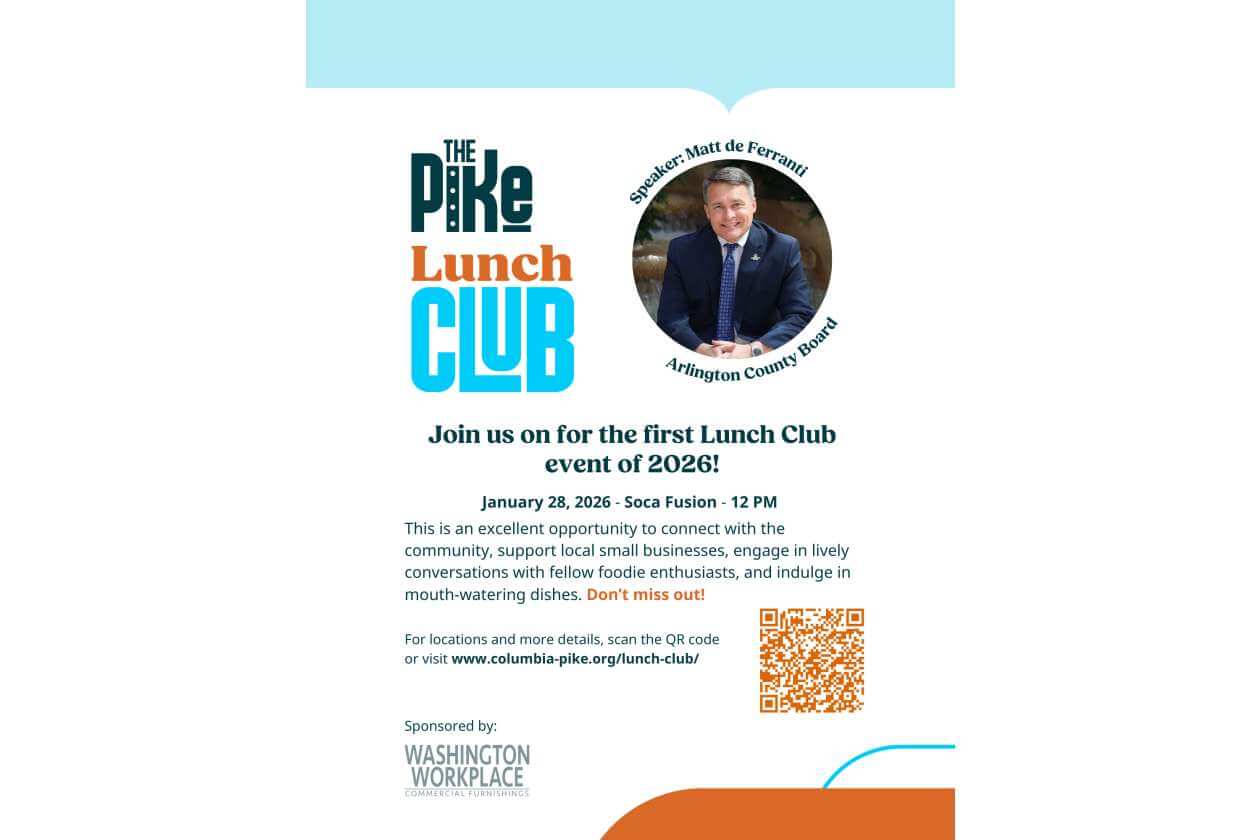 Join us for our January Lunch Club at Soca Fusion, a vibrant Caribbean restaurant known for bold flavors and welcoming vibes. Attendees will enjoy lunch while connecting with fellow Pike stakeholders and hearing from Matt de Ferranti, Arlington’s newly elected County Board Chair.