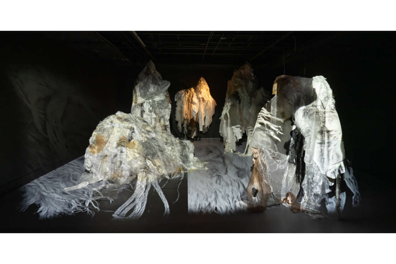 Lisu Vega in collaboration with Carlos Pedreáñez, The Uncertain Future of Absence (El Futuro Incierto de la Ausencia), 2025, Mixed-media and video installation made with recycled and interwoven fabric panels, Dimensions variable. Courtesy the artists, created with assistance from Juan Herniquez.