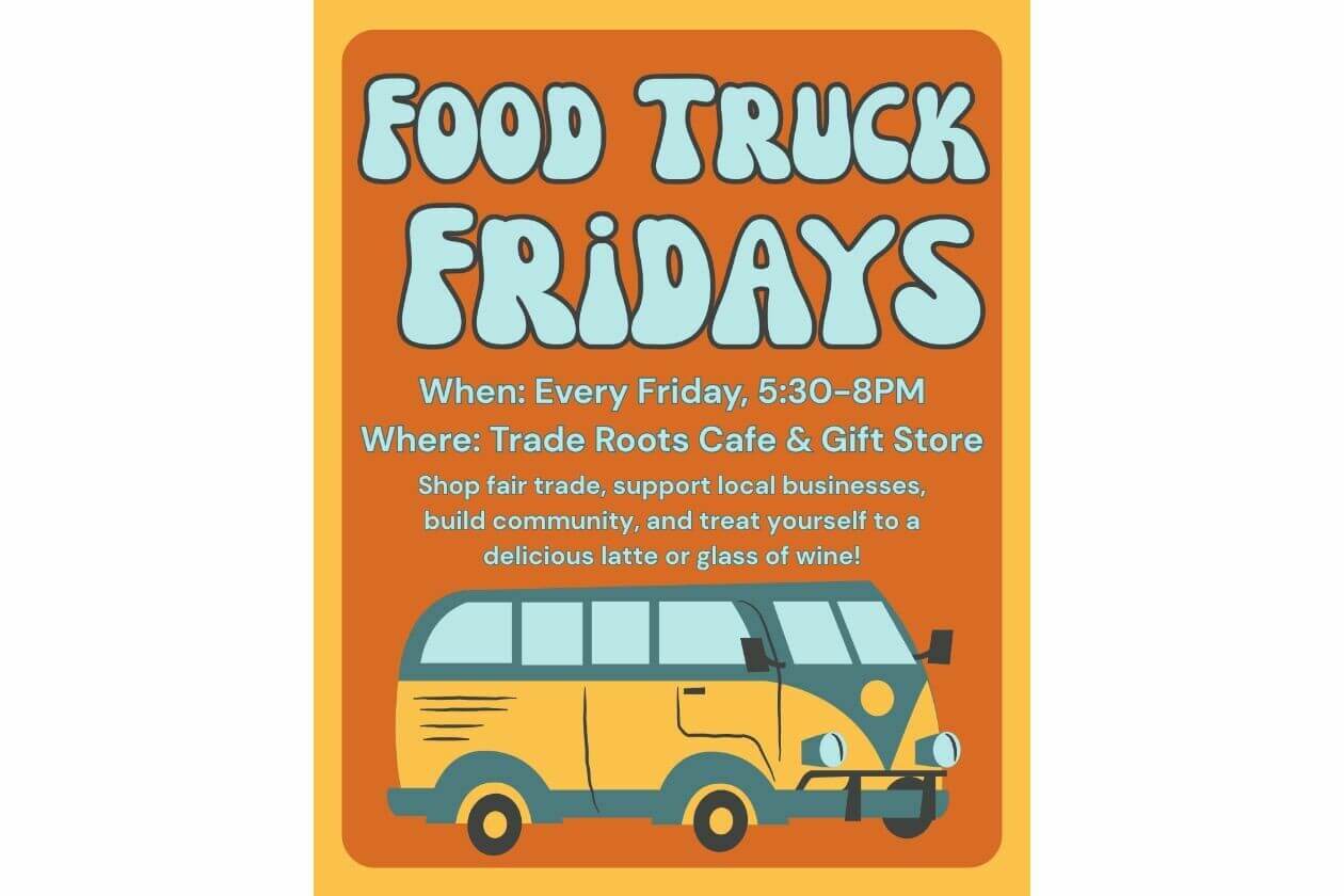 Join us every Friday from 5:30–8:00 PM (now through October 1st) for delicious eats and good vibes right outside Trade Roots!