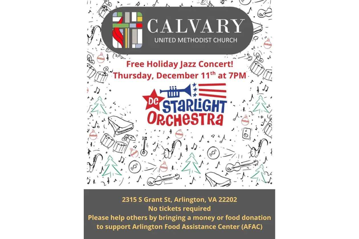 Enjoy classic holiday tunes from a full jazz big band! This free concert features classics like “Here Comes Santa Claus,” “Silver Bells,” “All I Want For Christmas Is You,” “Angels We Have Heard on High,” “Charlie Brown Christmas”, “Oh Chanukah,” and “What a Wonderful World.” You can help others by bringing a food or money donation, which will support the Arlington Food Assistance Center (AFAC).