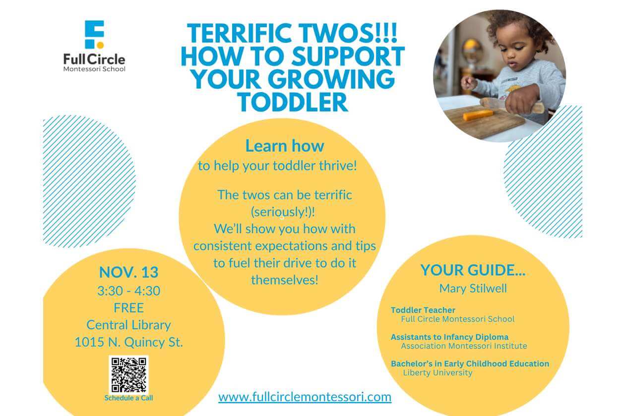 Full Circle Montessori School Assistants to Infancy trained guide, Mary Stilwell, will teach you how to help your toddler thrive and give you tips to fuel their drive to do it themselves!