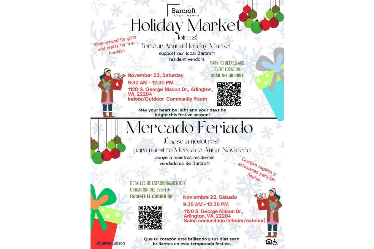 🎄 ¡Barcroft está organizando un Mercado Navideño este sábado! Ven a apoyar a nuestros vecinos y residentes de la comunidad que venden regalos, artesanías y artículos navideños. También tendremos socios comunitarios con recursos e información. Es una excelente manera de comprar local, apoyar a tus vecinos y conectar con la comunidad todo en un lugar. Entrada gratuita.