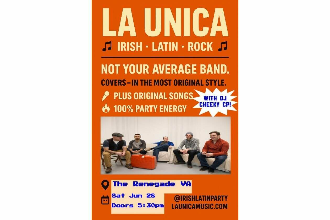 Looking for something different that still hits all the right notes? Come out for a high-energy night with La Unica, a unique blend of Irish, Latin, and rock influences that turns familiar covers into something fresh—and throws in plenty of 100% original songs that will have you dancing and singing along.