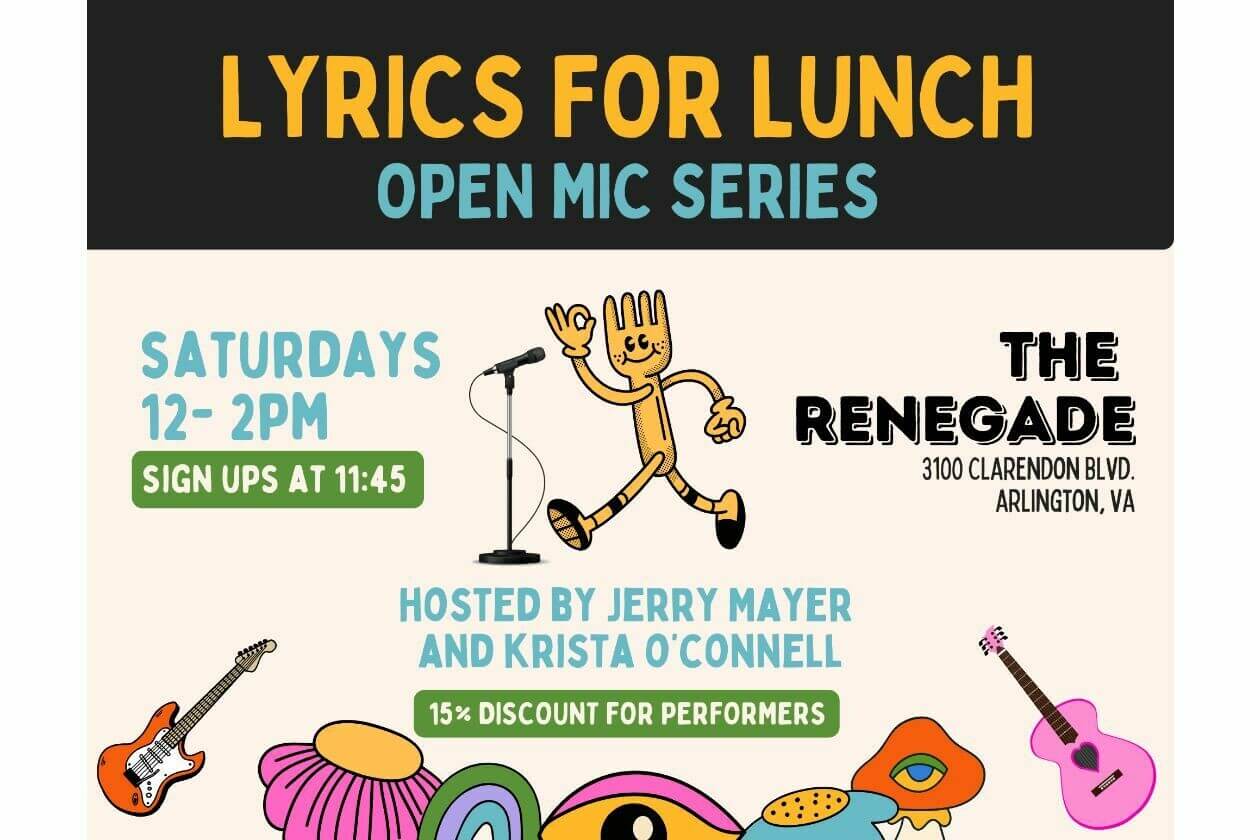 Share and support local music at the Lyrics for Lunch Open Mic. Join us Saturdays from 12-2pm at The Renegade in Clarendon. Performers get 15% off their tab. The open mic is all ages, and all are welcome!