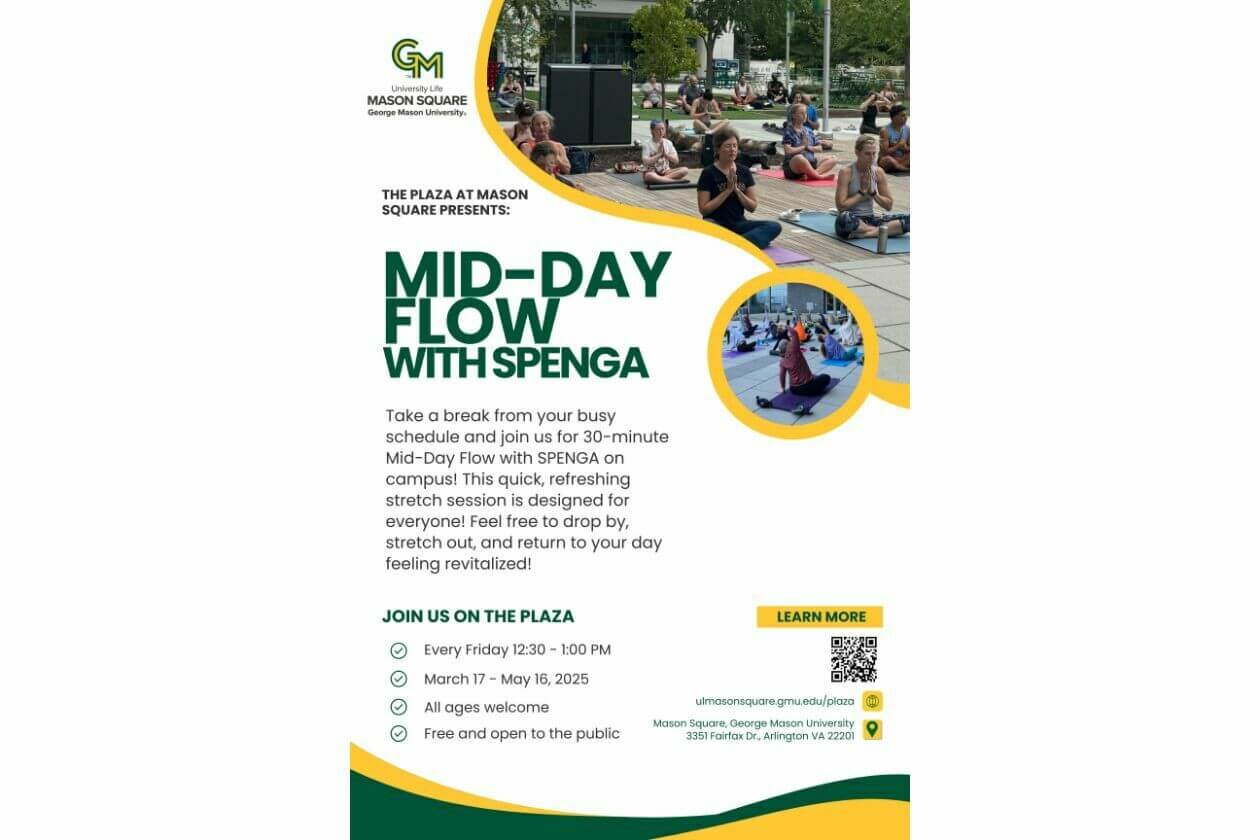 Take a break from your busy schedule and join us for 30-minute Mid-Day Flow with SPENGA on campus! This quick, refreshing stretch session is designed for everyone! Stop by, stretch out, and revitalize your day!