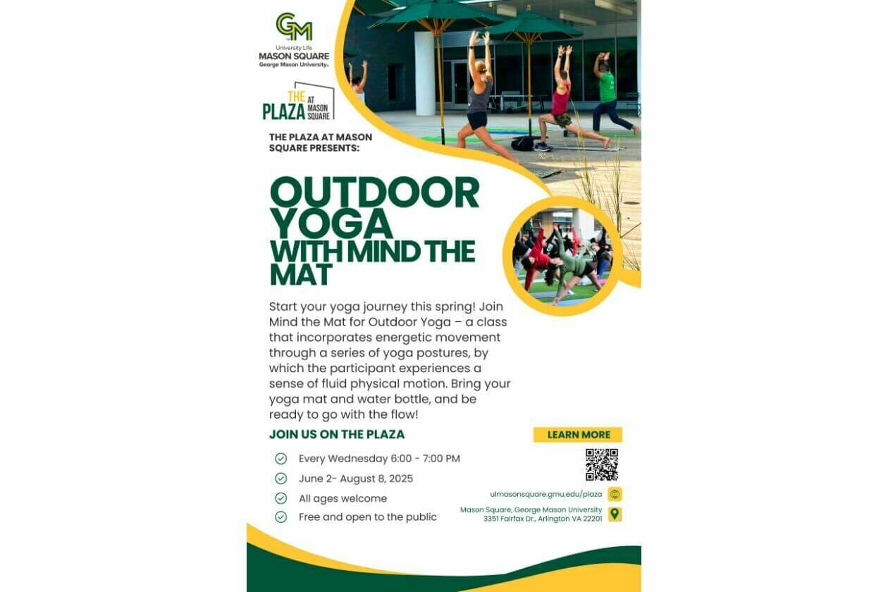 Join Mind the Mat for Outdoor Yoga – a class that incorporates energetic movement through a series of yoga postures, by which the participant experiences a sense of fluid physical motion. Bring your yoga mat and water bottle, and be ready to start your yoga journey!