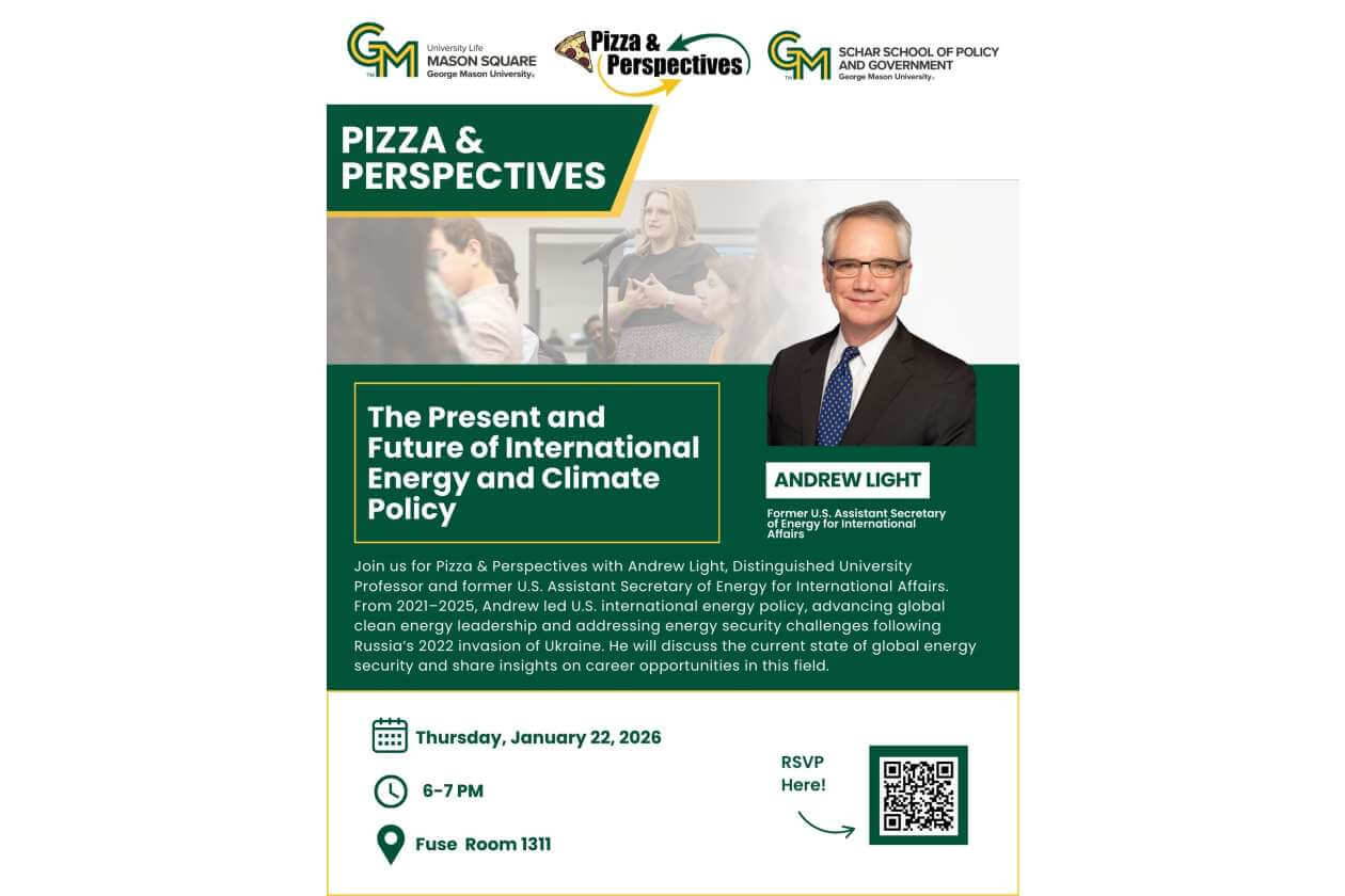 Join us for Pizza & Perspectives with Andrew Light, Distinguished University Professor and former U.S. Assistant Secretary of Energy for International Affairs. From 2021–2025, Andrew led U.S. international energy policy, advancing global clean energy leadership and addressing energy security challenges following Russia’s 2022 invasion of Ukraine. He will discuss the current state of global energy security and share insights on career opportunities in this field.