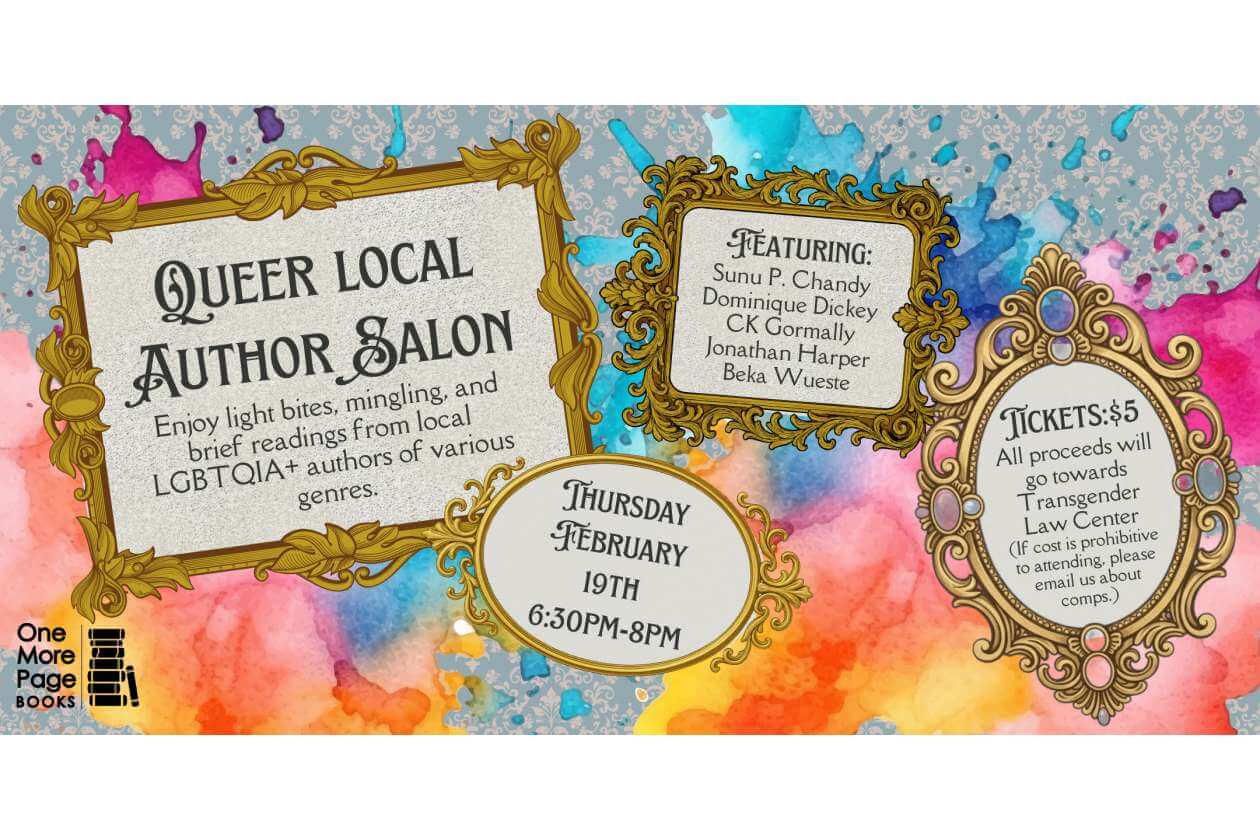 Join us for an evening spotlighting some local LGBTQIA2S+ authors! We’ll start things off with some light beverages and mingling (or quiet reading in solitude, for anyone feeling less social), and then we’ll hear a brief reading or introduction of each authors’ latest book. Their work spans across a wide variety of genres, including poetry, graphic novel, memoir, and fiction. Authors will be available for book signings after the readings. This is a ticketed event, with all the proceeds going to the Transgender Law Center. (If the $5 ticket price is prohibitive to your attendance, please email [email protected], and we will happily accommodate you!)
