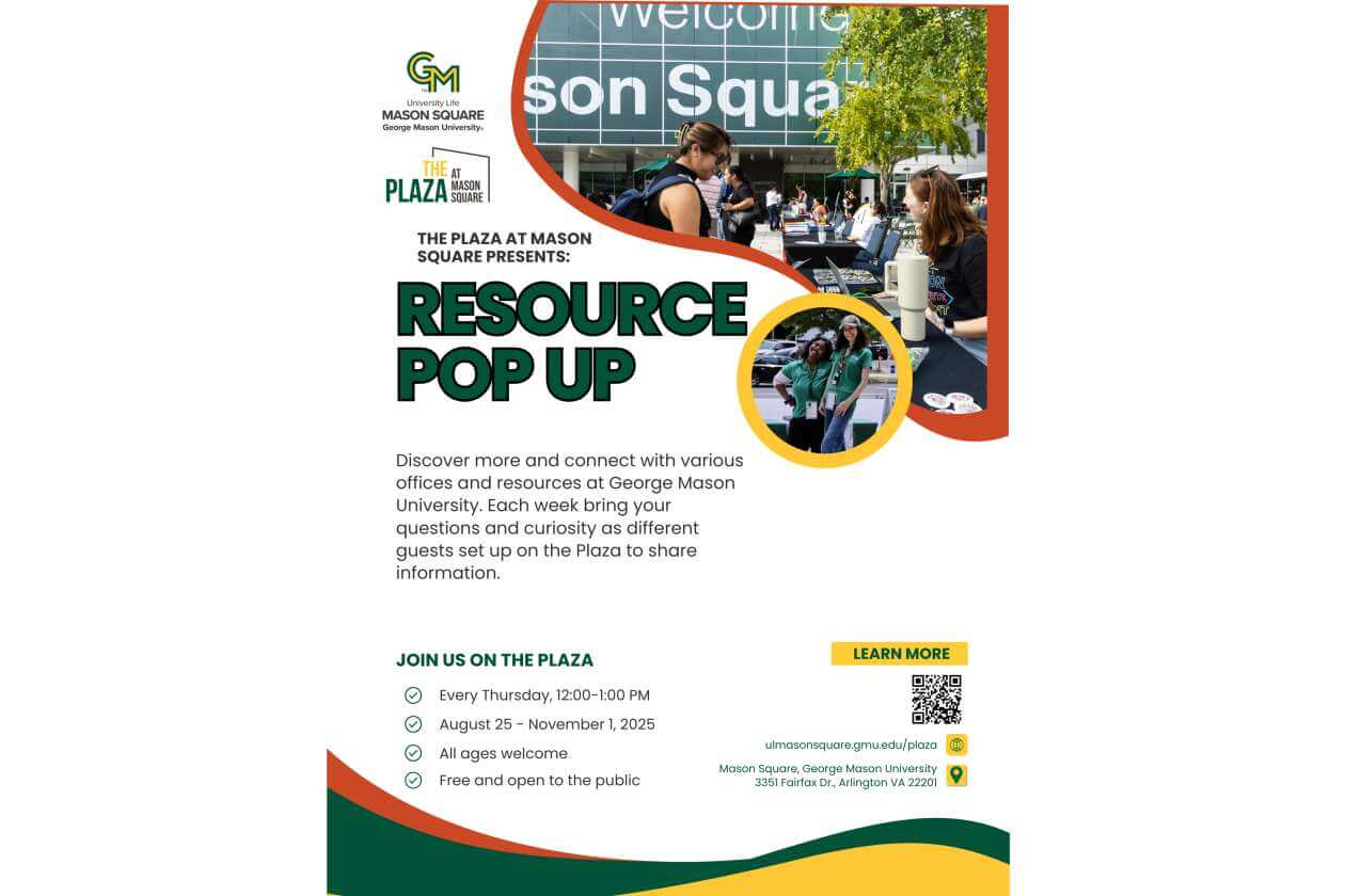 Discover more and connect with various offices and resources at George Mason University. Each week bring your questions and curiosity as different guests set up on the Plaza to share information.