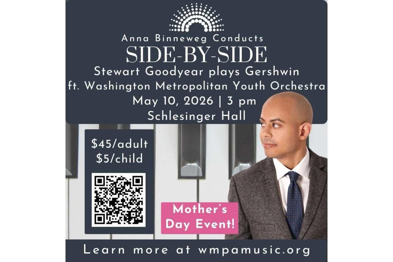 Celebrate Mother’s Day with a Side-by-Side orchestra concert with the Washington Metropolitan Philharmonic and Youth Orchestra on May 10 at 3pm, Schlesinger Concert Hall, featuring famous pianist Stewart Goodyear. Tickets are $45 per adult and $5 per child, and are on sale now at wmpamusic.org.