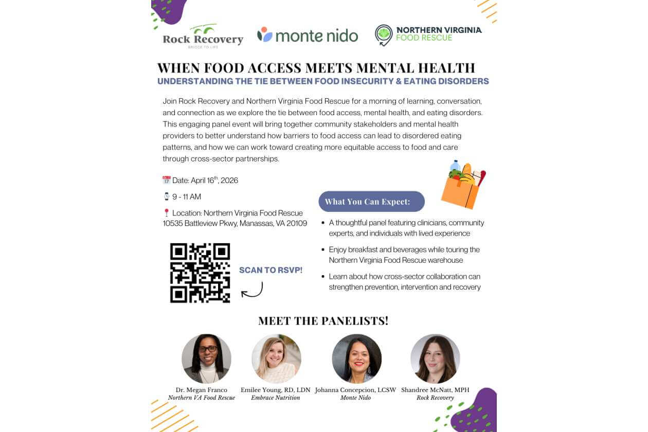 Join Rock Recovery and Northern Virginia Food Rescue for a morning of learning, conversation, and connection as we explore the intersection of food access, mental health, and eating disorders. This event will bring together community stakeholders and mental health providers to better understand how barriers to food access can lead to disordered eating patterns.