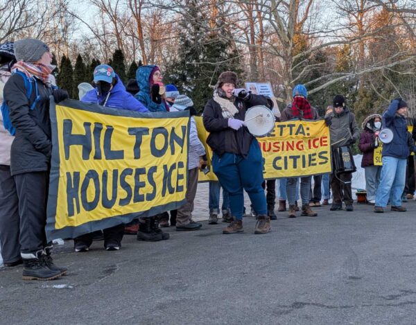 Protesters at the North Arlington home of Hilton CEO Christopher Nassetta (staff photo by Dan Egitto)