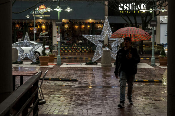 Rain and umbrellas and holiday lights in Shirlington (staff photo by Jay Westcott)
